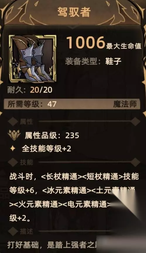 1. 驾驭者 掉落地点:全局掉落; 关键词:全技能等级,长杖精通、短杖精通技能等级,冰元素精通、土元素精通、火元素精通、电元素精通技能等级。
