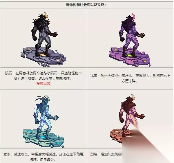 图五打法: 四大钢管。本场景,模式类似蠕动4图。四个角落的四块格子颜色跟四个怪身体的颜色是一致的,把这四个怪杀死在对应颜色的格子上,就通过了。任意一个怪被杀死在对应颜色格子里,会形成黑色圆圈,持续30秒后自动复活。若没在对应颜色上杀死,则形成假死状态,10秒后复活。需要注意的是黑色圆圈里若再杀死任意一个怪,则产生爆炸,伤害高,同时原先黑圈里跟后杀死的两个怪立刻复活。该图除了陨石以外,其他怪物暗抗-61,使用暗属性攻击会事半功倍。BOSS复活时会大范围起身震,需要注意。建议本图在进门之前每名队员根据自身技能商量分配一下自己负责的怪物,进门就往自己负责的区域跑。