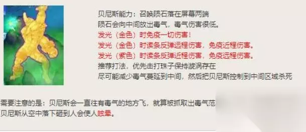 图三打法: 烟雾之贝尼斯。一进入副本就会看到BOSS召唤的陨石,并且陨石会放出毒雾。本场景左右各有两列架子,一列有三个。3HIT攻击后珠子会变漩涡。把架子上的珠子打成漩涡后,可以阻挡毒气蔓延,当贝尼斯没有毒气保护时就能对其造成伤害。