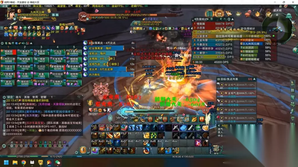 第一件事就是打英波加西赵,英波加阿云飞,把四分带中赶紧叠好,然后继续正常输出。其实手里捏着两个盾的时候是比较安全的,也不用担心。我这边运气好没有怎么中龙,大家如果中龙也不要担心,第一时间往boss背后跑,再用 v a 技能躲开。常见的 v a 技能是比较多的,如果大家可以扫一眼目标料列表,如果中龙很少只有一两条,可以手动点一下看看哪条离自己大概的位置在哪,这样带起来更容易些。 反正中龙的原则就是不要抽人群,还有这里有胡跑,我用起来是比较谨慎的,因为胡跑很容易把自己黏住 boss万一中到龙上就比较尴尬了,所以如果没有英美狗也可以不用胡跑,这个都可以。 最重要注意的就是像当现在这个情况,四周有火阵,中间有火球,这个时候就需要谨慎一些,看大概没问题了,甚至这时候还有龙,我就选择龙路过了以后在河龟砸回来正好这里有个山河,缓一手好,可以看到 boss,因为 boss 大概三十秒这个用一次这个龙,所以大家的服药一定要挂好,打到现在其实应该没有什么太大问题了。