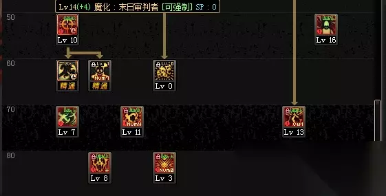 二:职业加点 通用类: 魔法暴击满 远古记忆满(配合宠物技能打爆发)悦翔点几级跳地板 恶魔类: Lv10恶魔之手:俗称黑手 自带1级 尽管每个版本都在加强然而并没有什么卵用。(技能说明为固伤实际为百分比数据) Lv15恶魔之力:被动技能 可以在攻击时按ZXC追加操作消耗恶魔能量攻击敌人(半魔流) 同时等级与核心buff堕落之魂等级挂钩,即每成长一级堕落之魂相应成长一级。 Lv15化魔:1级精通必满 消耗自身hp并转化为mp同时增加恶魔能量并增加变身持续时间,一次增加6.3秒 进图手动释放一次之后每8秒系统自动释放化魔,变身之后按一次就行(全程变身看这里) Lv15死亡切割:点5出前置 攻击敌人吸血,前期练级满 Lv15半魔化:必满 恶魔能量超过一半以上时可以释放半魔化,基础攻击形态改变,同时半魔化状态下增加15%暴击伤害 注意先半魔化再魔化变身可继承爆伤加成 Lv20裂地锤:1或满 清怪技能 输出不好打全 Lv20镰刀精通:必满不解释 Lv25堕落之魂:1级精通必满 且等级挂钩恶魔之力(恶魔之力等级+1实为堕落之魂等级)复仇者核心倍率buff Lv25回旋飞镰:1或满 俗称溜溜球 形态一般 伤害较高 攻速越快,收招越快 Lv30复仇之刺:1或满 形态优秀瞬发两段攻击hit 第一下带有打断判定 且被击时可强制释放(反击)功能性技能 Lv30恶魔诅咒:必满 全职业数一数二的被动技能之一 每级增加3%技能攻击力(时装,白金技能选择) Lv35厄运之轮:必满出tp 刷图核心输出小技能之一 伤害高 多段位移攻击 出手快 Lv40恶魔之握:必满出tp 伤害高,形态好 吸附握击带有打断判定 伤害大头是手臂爆炸 Lv40黑暗之触:1或满 触手 除了个人钟爱,基本都是点1清小怪 瞬发抓取判定 功能性技能 Lv45黑暗权能:必满出tp 抓取敌人后再按指令键一次可脱手控制敌人 伤害高,脱手控 现版本存在攻速过高导致抓取判定失效的bug Lv50魔化:末日审判者:一觉主动变身技能 黑又硬不解释 变身后三速 防御 血量大幅度提升,免疫异常(出tp)全程霸体 衍生技:审判:真正的主动一觉技 两种攻击模式按住前后方向键+审判即抓住敌人向前拖动攻击 不按方向键为直接两段瞬发挑击(全职业最快爆发技能之一)复仇者排面技能 衍生技:恶魔屏障:可减少90%被攻击伤害 Lv48恶魔唤醒:一觉被动 每级增加魔化后平x技能和审判伤害(即增伤被动技能,只是每个部分增伤率很率略有不同) 注意审判的百分比跟随一觉变身等级 Lv60地狱之门:不学或满 60ex技能 形态墨迹 Y轴判定范围感人 伤害cd对不起技能地位 除了极限爆发点之外,基本不用学 Lv70末日浩劫 必满 形态优秀 出手快 两段攻击且带有延迟伤害判定且伤害不俗 Lv70原罪之力:必满 二觉被动 每成长一级增伤2% Lv75不朽战吼:必满 瞬发多hit攻击 长按可消耗恶魔能量追加两段攻击 伤害高 范围大 cd短 不解释排面技能 Lv80毁灭强击:满 现版本略墨迹,可蓄力消耗恶魔能量增加黑炎灼烧伤害 突进技能 Lv85永堕:混沌弑神:必满 二觉主动 多段撕裂攻击然后进行终结一击,撕裂带有位移判定 按X进行撕裂加速 按Z蓄力最后一击最大化伤害 参考加点 加点上面只要大方向不太偏离,按照最适合自己的来就行,不多赘述。