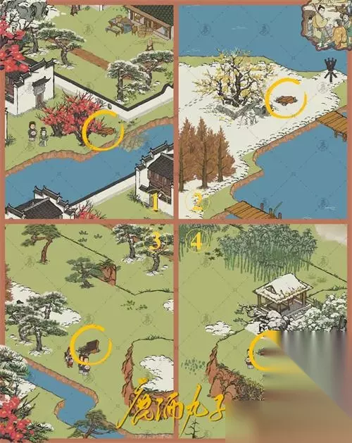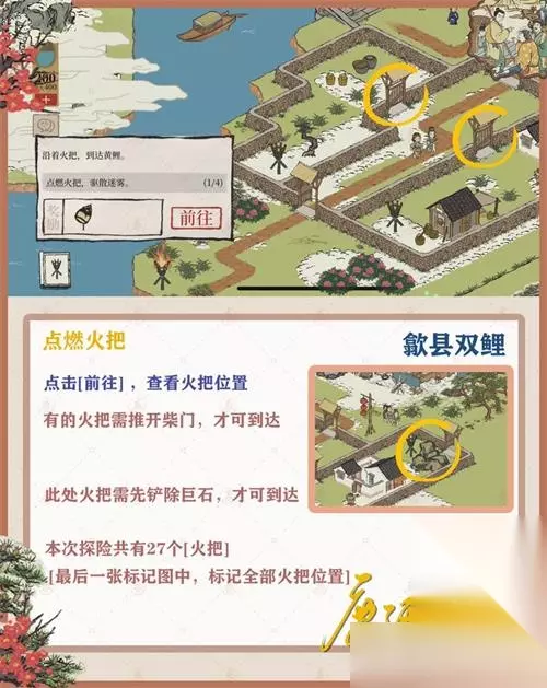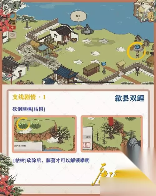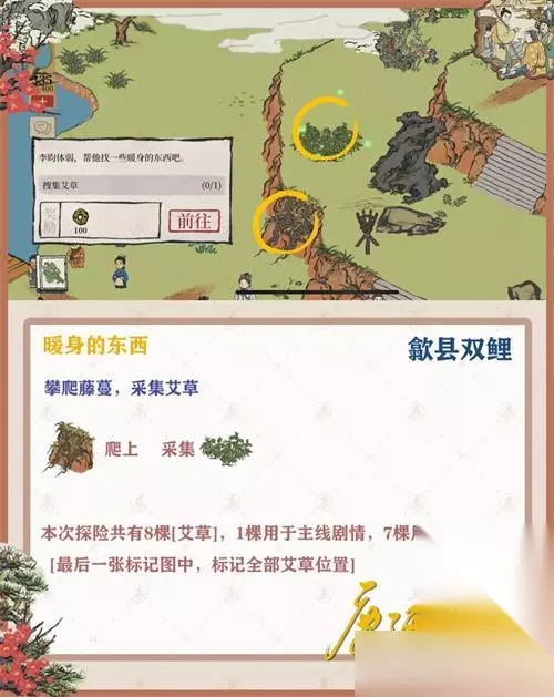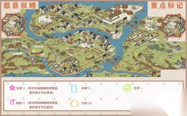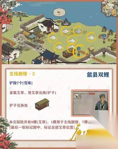《江南百景图》徽州府探险第二章歙县双鲤怎么过?很多玩家不知道《江南百景图》徽州府探险第二章歙县双鲤钥匙宝箱在哪,下面233乐园小编给大家整理了《江南百景图》徽州府探险第二章歙县双鲤通关攻略,快来看看吧! 《江南百景图》徽州府探险第二章歙县双鲤: 1.暖身的东西: 本次探险共8棵[艾草],1棵用于主线剧情,7棵用于支线剧情 最后一张标记图中,标记全部艾草位置