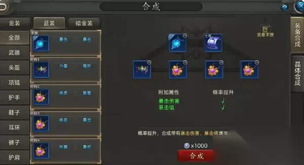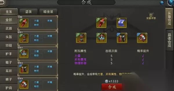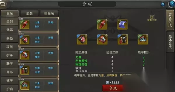 四、合成策略决策树 新手期:专注蓝装合成,快速累积战力,无视词条组合。 金装起步: 资源匮乏 → 选择22合成法,低成本打造可用金装。 有稳定资源 → 采用44合成法,稳步提升核心装备。 后期攻坚: 核心武器/首饰 →55合成法拉满,追求3词条完美毕业。 防具/次级装备 →44合成法平衡资源。