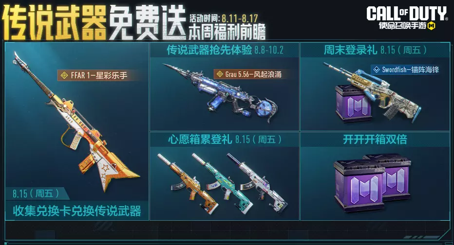 没错,又来送传说了!8月15日(本周五),传说免费送活动上线。战士们完成任务领兑换卡,集齐兑换卡即可兑换传说级武器FFAR 1-星彩乐手,千万别错过啦!