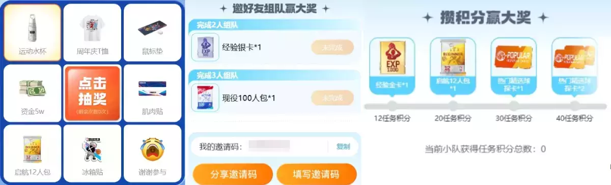 完成任务领取抽奖机会,邀请好友组队领取银卡、现役100人包,一起组队攒积分更能兑换金卡、启航12人包、热门精选球星卡