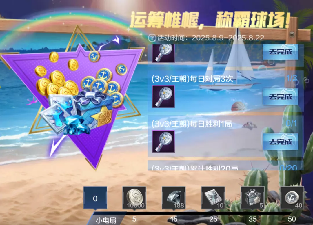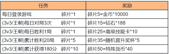 8月9日-8月22日期间,每日登录游戏并完成相应对局任务,即可获赠金币*10000、钻石*188、高级技能卡*10、随机晋升礼包*5、特殊货币*40!