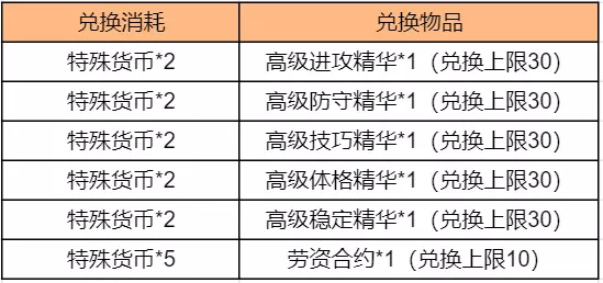 特殊货币还可用于兑换高级进攻精华、高级防守精华、高级体格精华、高级稳定精华、高级技巧精华、劳资合约等资源,轻松组建你的王朝!