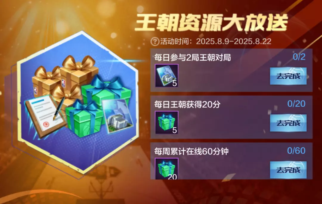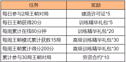 8月9日-8月22日期间,队长大大完成所有相应对局任务,可累计获赠建造许可证*5、训练精华礼包*25、高级训练精华礼包*60、劳资合约*10!队长们想要王朝资源的留言小师妹都看到啦,这次可别错过了哦~