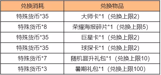 特殊货币可用于兑换荣耀海报碎片、大师卡、巨星卡、球探卡、随机晋升礼包、暑期礼包等好礼,队长们快来一起打球吧!