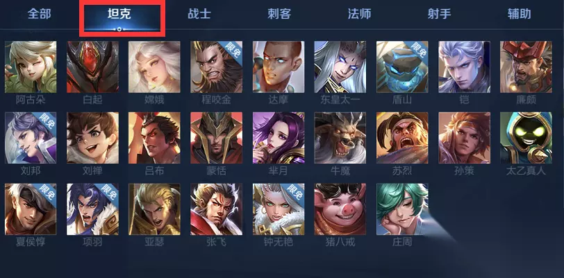 王者荣耀有坦克、战士、刺客、法师、射手、辅助这六大类英雄,截至2022年1月25日共计108个英雄。 一、坦克类英雄: 白起、嫦娥、程咬金、东皇太一、盾山、铠、廉颇、刘邦、刘禅、吕布、芈月、牛魔、苏烈、孙策、太乙真人、夏侯惇、项羽、亚瑟、张飞、钟无艳、猪八戒、庄周、达摩、蒙恬、阿古朵。