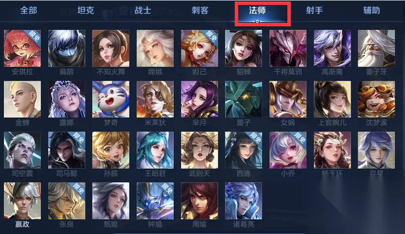 四、法师类英雄: 安琪拉、扁鹊、不知火舞、嫦娥、妲己、貂蝉、干将莫邪、高渐离、姜子牙、梦奇、露娜、米莱狄、芈月、墨子、上官婉儿、沈梦溪、孙膑、王昭君、西施、小乔、杨玉环、奕星、张良、甄姬、钟馗、周瑜、嬴政、司马懿、女娲、诸葛亮、司空震、武则天、金蝉。