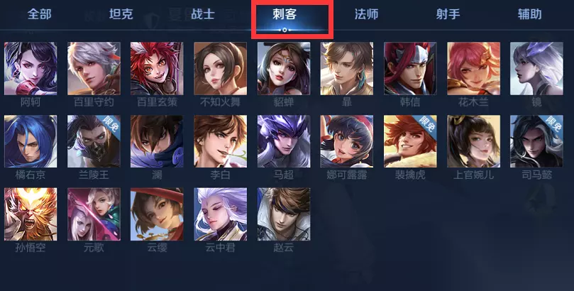 三、刺客类英雄: 阿轲、百里玄策、不知火舞、貂蝉、韩信、花木兰、镜、橘右京、兰陵王、娜可露露、裴擒虎、上官婉儿、孙悟空、赵云、元歌、李白、司马懿、百里守约、云中君、马超、澜、云樱、暃。