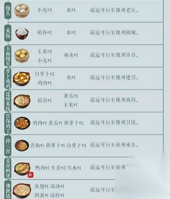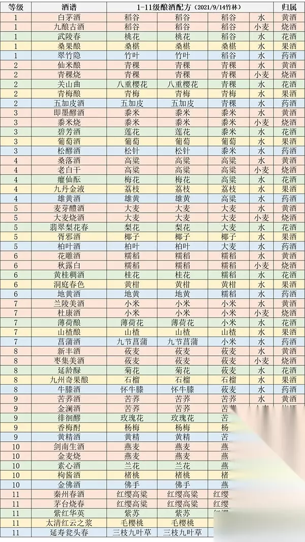 一级酿酒配方 1、白茅酒:稻谷+稻谷+稻谷+水,归属:黄酒。 2、九酿古酒:桃花+桃花+稻谷+水,归属:烧酒。 3、武陵春:桃花+桃花+稻谷+水,归属:花酒。 4、桑果酿:桑椹+桑椹+桑椹+水,归属,果酒。 5、翠竹隐:竹叶+竹叶+稻谷+水,归属:药酒。 二级酿酒配方 1、仙米酿:仙米酿+青稞+青稞+青稞,归属:黄酒。 2、青稞烧:青稞+青稞+青稞+小麦,归属:烧酒。 3、关山曲:八重樱花+八重樱花+青稞+水,归属:花酒。 4、青梅酿:青梅+青梅+青梅+水,归属:果酒。 5、五加皮酒:五加皮+五加皮+青稞+水,归属:药酒。 三级酿酒配方 1、即墨醪酒:黍米+黍米+黍米+水,归属:黄酒。 2、黍米烧:黍米+黍米+黍米+小麦,归属:烧酒。 3、碧芳酒:莲花+莲花+黍米+水,归属:花酒。 4、葡萄酒:葡萄+葡萄+葡萄+水,归属:果酒。 5、松醪酒:松针+松针+黍米+水,归属:药酒。 四级酿酒配方 1、桑落酒:高粱+高粱+高粱+水,归属:黄酒。 2、老白干:高粱+高粱+高+小麦,归属:烧酒。 3、瘤仙酝:梅花+梅花+高粱+水,归属:花酒。 4、九丹金液:荔枝+荔枝+荔枝+水,归属:果酒。 5、雄黄酒:雄黄+雄黄+高梁+水,归属:药酒。 五级酿酒配方 1、麦芽醴酒:大麦+大麦+大麦+水,归属:黄酒。 2、大麦烧酒:大麦+大麦+大麦+小麦,归属:烧酒。 3、翡翠梨花春:梨花+梨花+大麦+水,归属:花酒。 4、胥邪酒:椰子+椰子+椰子+水,归属:果酒。 5、柏叶酒:柏叶+柏叶+大麦+水,归属:药酒。 六级酿酒配方 1、花雕酒:糯稻+糯稻+糯稻+水,归属:黄酒。 2、秋露白:糯稻+糯稻+糯稻+小麦,归属:烧酒。 3、黄桂稠酒:桂花+桂花+糯稻+水,归属:花酒。 4、洞庭春色:黄柑+黄柑+黄柑+水,归属:果酒。 5、地黄酒:地黄+地黄+糯稻+水,归属:药酒。 七级酿酒配方 1、兰陵美酒:小米+小米+小米+水,归属:黄酒。 2、杜康酒:小米+小米+小米+小麦,归属:烧酒。 3、薄荷酿:薄荷花+薄荷花+小米+水,归属:花酒。 4、山楂酿:山楂+山楂+山楂+水,归属:果酒。 5、莒蒲酒:九节莒蒲+九节莒蒲+小米+水,归属:药酒。 八级酿酒配方 1、新丰酒:莜麦+莜麦+莜麦+水,归属:黄酒。 2、枣集美酒:莜麦+莜麦+莜麦+小麦,归属:烧酒。 3、延龄碌:菊花+菊花+莜麦+水,归属:花酒。 4、九州奇果酿:石榴+石榴+石榴+水,归属:果酒。 5、牛膝酒:怀牛膝+怀牛膝+莜麦+水,归属:药酒。 九级酿酒配方 1、苦荞酒:苦荞+苦荞+苦荞+水,归属:黄酒。 2、金澜酒:苦荞+苦荞+苦荞+小麦,归属:烧酒。 3、徘徊醪:玫瑰花+玫瑰花+苦荞+水,归属:花酒。 4、香梅酎:杨梅+杨梅+杨梅+水,归属:果酒。 5、黄精酒:黄精+黄精+苦荞+水,归属:药酒。 十级酿酒配方 1、剑南生酒:燕麦+燕麦+燕麦+水,归属:黄酒。 2、金麦烧:燕麦+燕麦+燕麦+小麦,归属:烧酒。 3、素心酒:兰花+兰花+燕麦+水,归属:花酒。 4、枸酱酒:楮桃+楮桃+楮桃+水,归属:果酒。 5、金佛酒:佛手+佛手+燕麦+水,归属:药酒。 十一级酿酒配方 1、秦州春酒:红缨高梁+红婴高粱+红缨高粱+水,归属:黄酒。 2、茅台烧春:红缨高粱+红缨高粱+红缨高粱+小麦,归属:烧酒。 3、紫红华英:紫苏+紫苏+红缨高粱+水,归属:花酒。 4、太清红云之浆:毛樱桃+毛樱桃+毛樱桃+水,归属:果酒。 5、延寿瓮头春:三枝九叶草+三枝九叶草+红缨高粱+水,归属:药酒。 以上就是游戏中所有的酿酒配方,从1级到11级,包含了黄酒、烧牛、花酒、果酒、药酒,希望对大家有所帮助,更多游戏攻略可以关注本站。