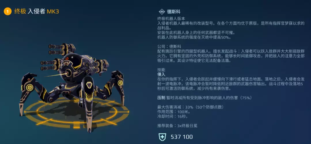 [终极入侵者] 的跳跃距离约150米,落地时触发的电脉冲可覆盖 100 米范围,不仅伤害可观,更附带群体压制效果,能在入场瞬间大幅削弱敌方输出火力。再结合其自带的 33% 伤害削减与不俗的面板耐久,足以强势压制敌方后排。