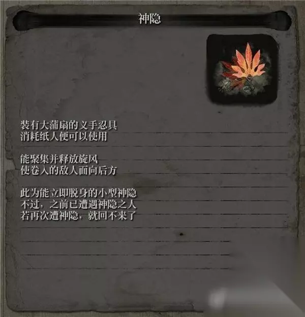 而它有一条神奇的特殊效果:对僧人使用会一击必杀,这也就是所谓“神隐”吧。 神隐的升级改造也比较简单,只有二度神隐和捐赠簿两个,其中二度神隐解锁了一次聚集可以释放两次的功能,捐赠簿在此之上多了一条比较有意思的功能,那就是会使敌人反向的同时掉落道具和金钱,不过使用消耗也增加到了每次四枚纸符。后期或许可以拿它来刷钱或者某些道具,例如飞雪。 初始—单击聚风,持续4秒。再次单击激发,能让小兵背对你,能忍杀。 二度—能放两次,聚风时间内激发一次则持续时间重置。 布施回旋—能让敌人额外掉钱+道具,一名敌人仅生效一次。可以配合召物气球在刷物品的时候使用。 坠落之谷-铁炮要塞佛像处继续向前,在击败精英敌人长爪蜈蚣-峰云的场景拾取。 以上就是神隐相关介绍,希望能帮助到各位玩家。