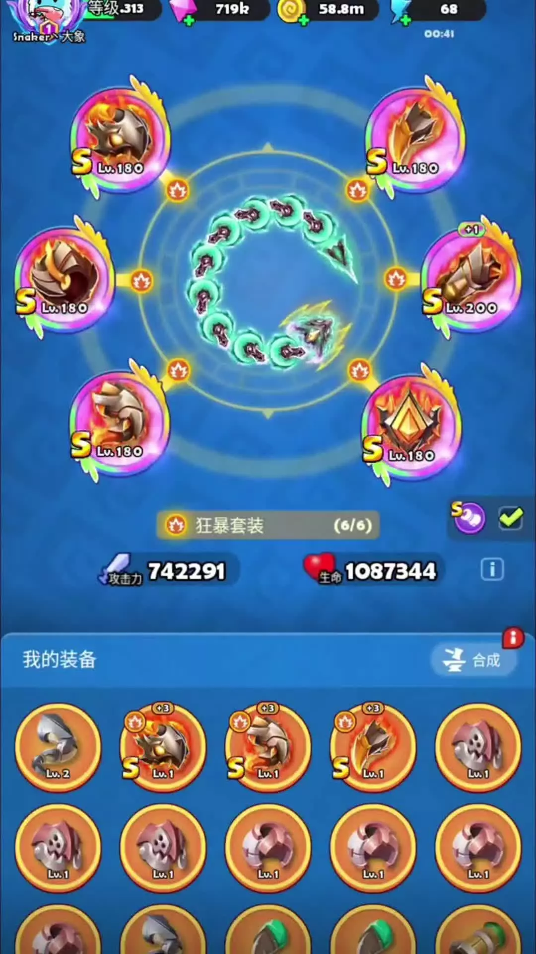 这是手游《贪吃蛇无尽大作战》的情报内容,展示了游戏内的开蛋、宝箱抽奖玩法,还有章节礼包,狂暴宝箱6次内必得史诗装备,46次内必得S级套装装备,能获取不同品质的装备。