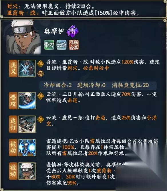 u00a0奥义:吾流·里霞斩·改:对敌小队造成120%伤害,选定目标附带封穴。必杀时必中 奥摩伊在第四次忍界大战,面对大量白绝时,会以剑快速地使出月牙形的大型斩击。