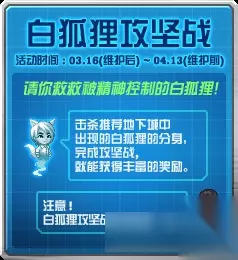 活动内容: 击杀推荐地下城中出现的白狐狸分身完成攻坚战,就呢个获得丰富的奖励; 白狐狸攻坚战每周刷新一次。