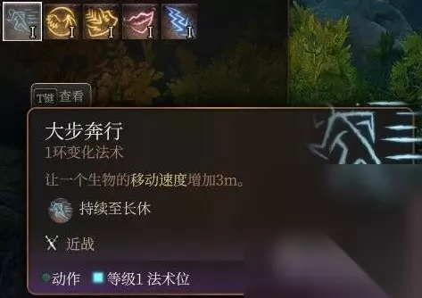 大步奔行 给一个目标提供+3m的移动速度直到长休,看着效果一般但实际上极强,给近战大哥加这点速度冲到对面脸上框框两刀比你放个一环法术打伤害好用多了。