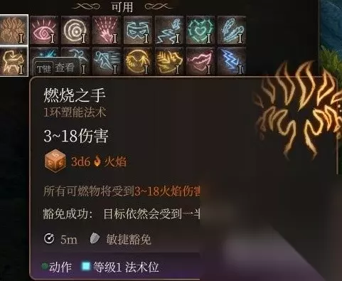 燃烧之手 最小丑一环法术,伤害看似不错还是aoe的情况下最大的缺点是近距离法术近战强度太高的同时导致了所有近距离法术都显得非常小丑,而且身为火焰法术用来点炸药点油脂的功能也因为是进距离施法的原因陷入了尴尬的境地我的评价是不如伊格尼斯