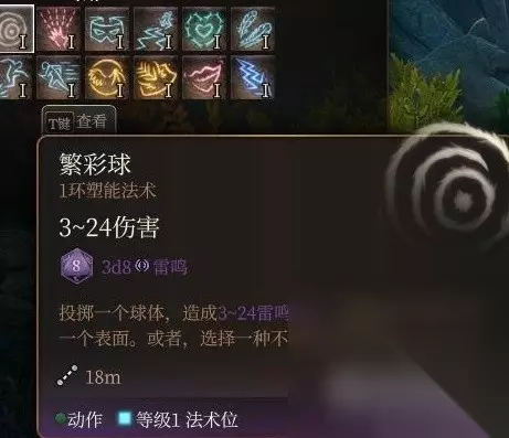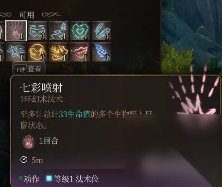 七彩喷射 近战范围aoe上目盲但有目标生命值上限如果不是有这个上限的话是个很好用的辅助法术,不管是法爷被包围了用这个逃命(被单个威胁了用电爪)还是游荡者之类的兼职一下打辅助都好用,但这个生命值上限太低到了中期就没啥意义了。