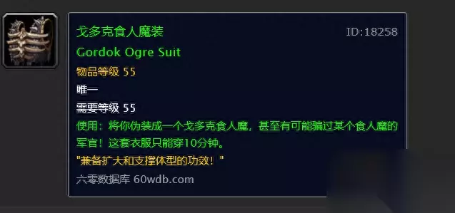 使用:将你伪装成一个戈多克食人魔,甚至有可能骗过某个食人魔的军官!这套衣服只能穿10分钟。 获得方法:任务,裁缝和制皮制作。 简介:这件物品是独特唯一的,一次只能在身上放一件。如果想要储存多件,必须使用工会银行或者在不同角色之间相互邮寄。它不是一个饰品,而且没有冷却时间,可以在任何地方使用。怀念60年代热闹非凡的铁炉堡桥头总会看见吃变大药剂的食人魔舞者 2.美味风蛇