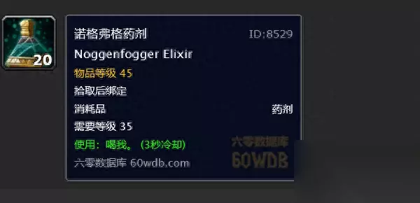 使用:变身为敌对阵营(冷却30分钟) 获取方法:世界掉落 简介:很出名的收藏类饰品,价格通常都比较高,如果你不差钱的话可以买一个偶尔得瑟下 5.诺格弗格药剂