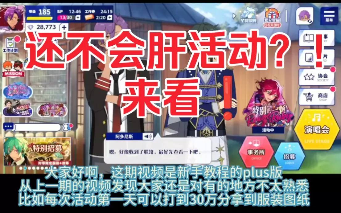 这是《偶像梦幻祭》的新手教程,展示了演唱会组队、选择提升粉丝数的偶像、自动组队功能以及音量设置等游戏操作,帮助新手快速上手游戏玩法。