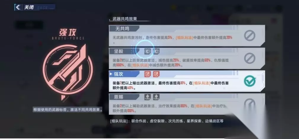 1 装备2件防御武器提升减伤等属性;2 装备2件攻击武器提高最终伤害; 3 装备2件辅助武器提高治疗效果 无共鸣 无武器共鸣激活时,最终伤害提高5%,[组队玩法]中最终伤害额外提高20%。 坚毅 装备2把以上防御武器激活,减伤提高25%、破盾效率提高60%、仇恨值提高60%,在[组队玩法]中伤害额外提高20%。 强攻 装备2把以上输出武器激活,最终伤害提高10%,在[组队玩法]中最终伤害额外提高40%。 恩赐 装备2把以上辅助武器激活,治疗效果提高100%,在[组队玩法]中治疗效果额外提高和100%。 激活“强攻”这一共鸣效果的时候,如果佩戴防御武器可以减少敌方伤害,如果佩戴趁手的辅助武器还可以打持久战。 激活“恩赐”这一共鸣效果更适合逐步消耗敌方的血条,搭配输出武器可以攻愈兼备。很适合不太擅长躲避伤害的拓荒者,而且如果拓荒者选择“恩赐”效果的话,个人战更受欢迎。 因为武器共鸣在组队玩法中都具有附加效果,那么在组队的时候,更适合一个“坚毅”加上2~3个“强攻”的搭配。当然这种搭配适合速战速决,如果是四个“恩赐”或者是四个“坚毅”,那么持久战消耗下去也很有趣。 无论是那一类的武器共鸣效果,针对不同特点的拓荒者展示出来的效果也不同,如果再搭配上合适的武器的元素属性,那么战斗将更加得心应手。