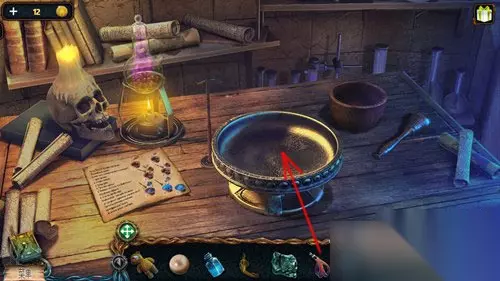 点击凿子,再点击盆中的蓝色晶体,将它碾碎。