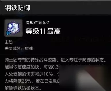 技能一:钢铁防御 需要手动开启,以百分之25的伤害为代价,减少受到伤害百分之10%。建议在PVP的时候开启,可以让在自己追不到人的情况小少收到一些远程以及AOE伤害。