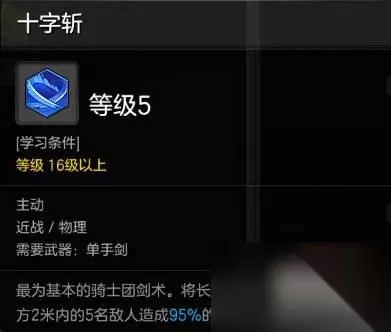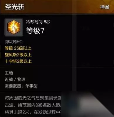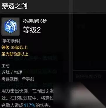 技能七:穿透之剑 神技。骑士PVP唯一打断对手而且带控制高伤害大技能技能,技能无消耗CD8秒,能位移、逃跑。因为技能点紧张,所以只点1-2点。但是还是很屌的技能。