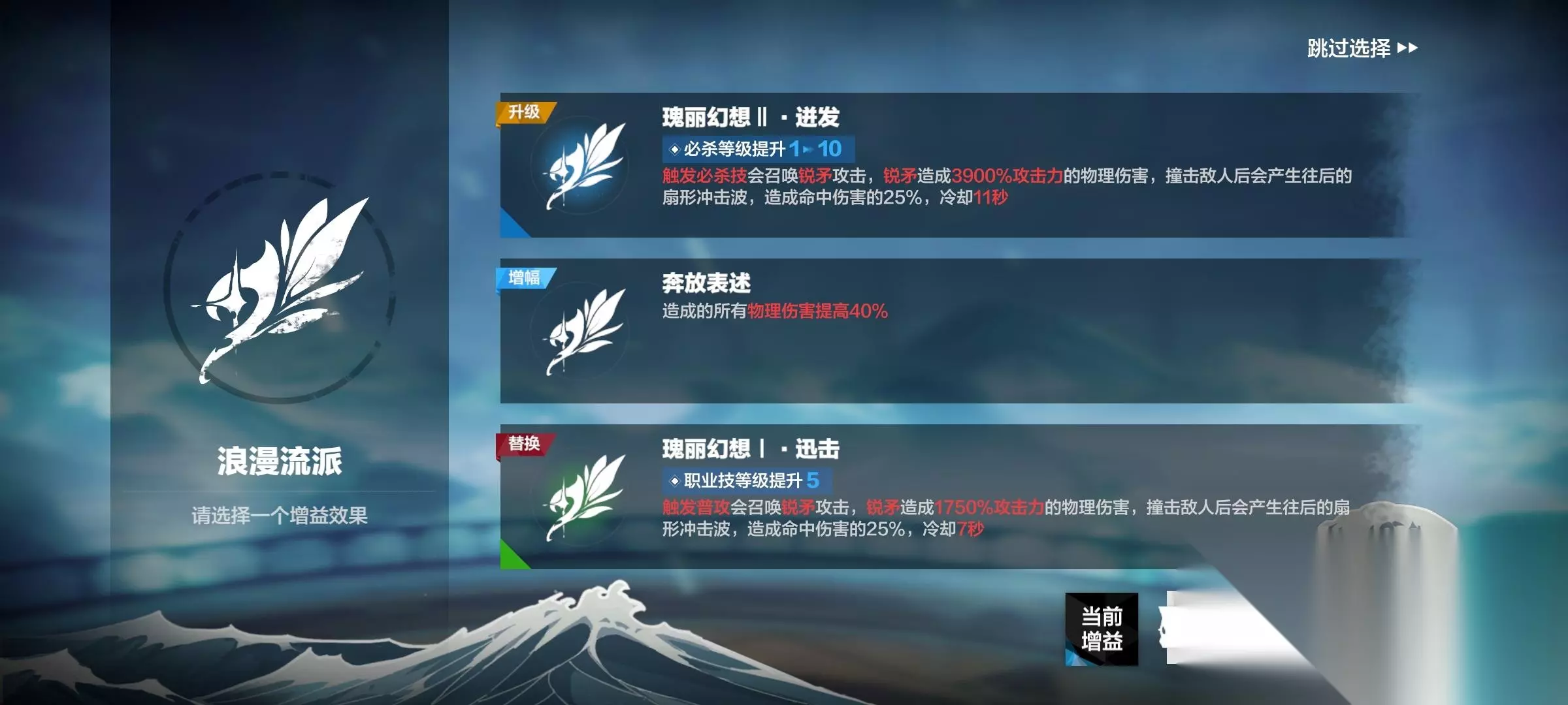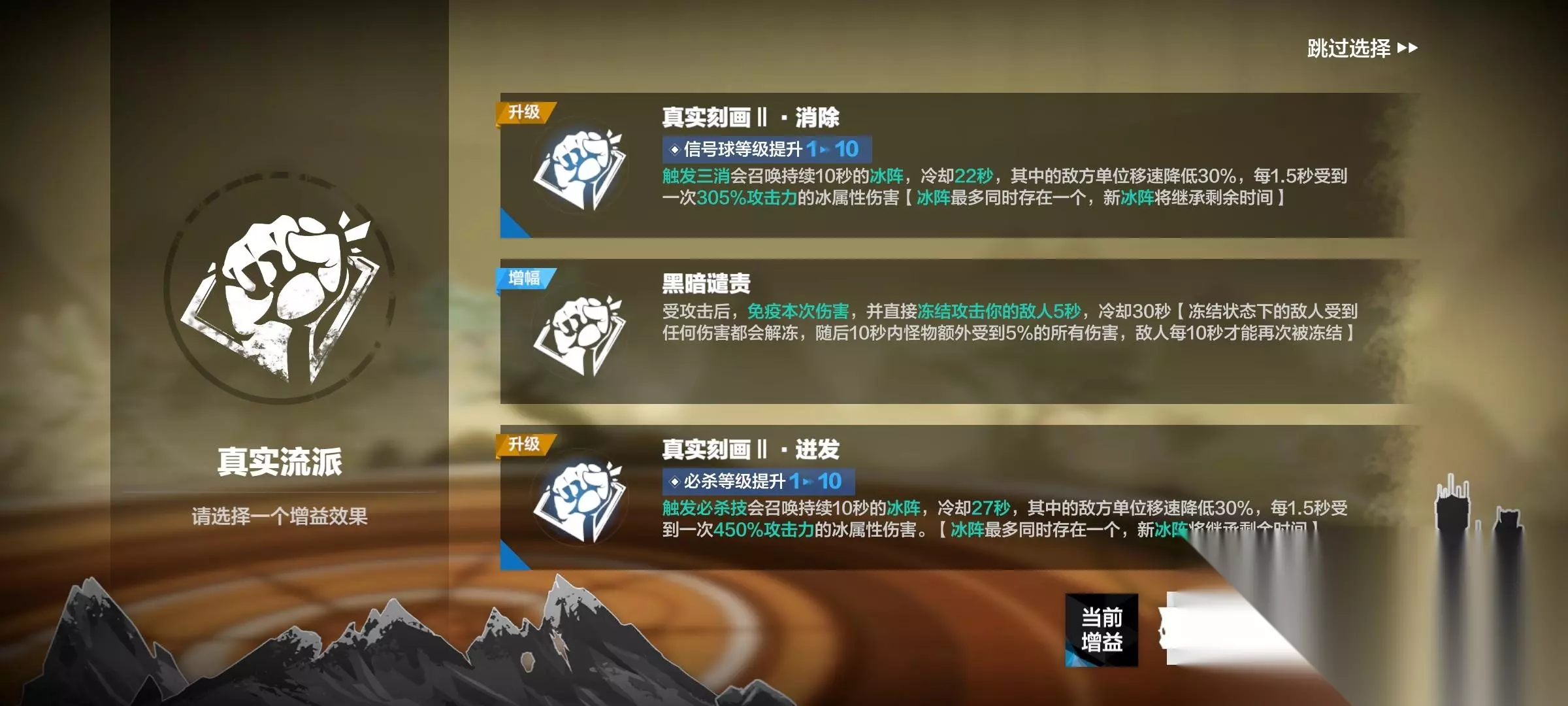 选择流派后,有三个随机选项,buff或增益(真实流派为例)
