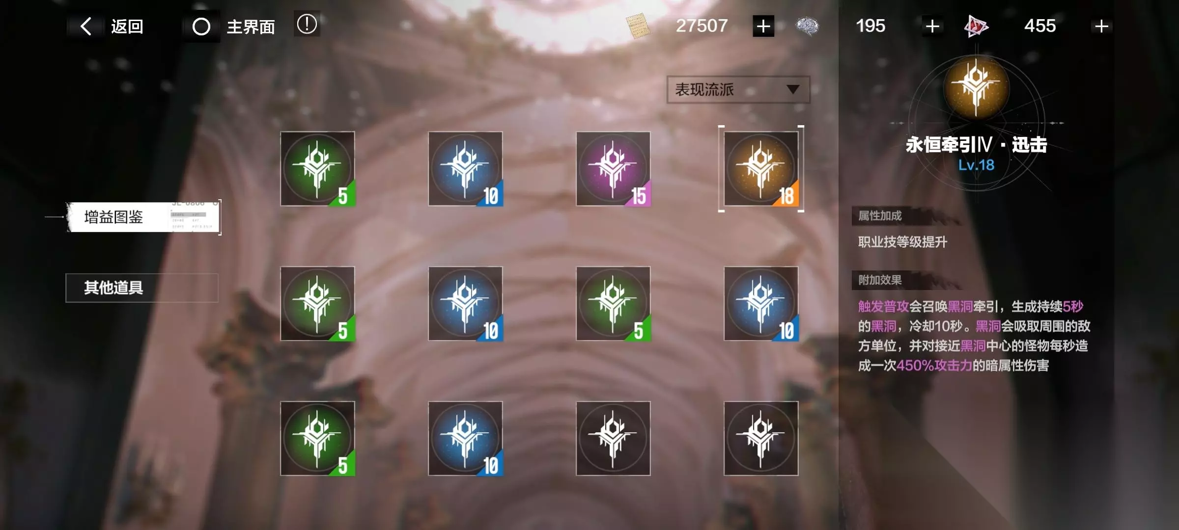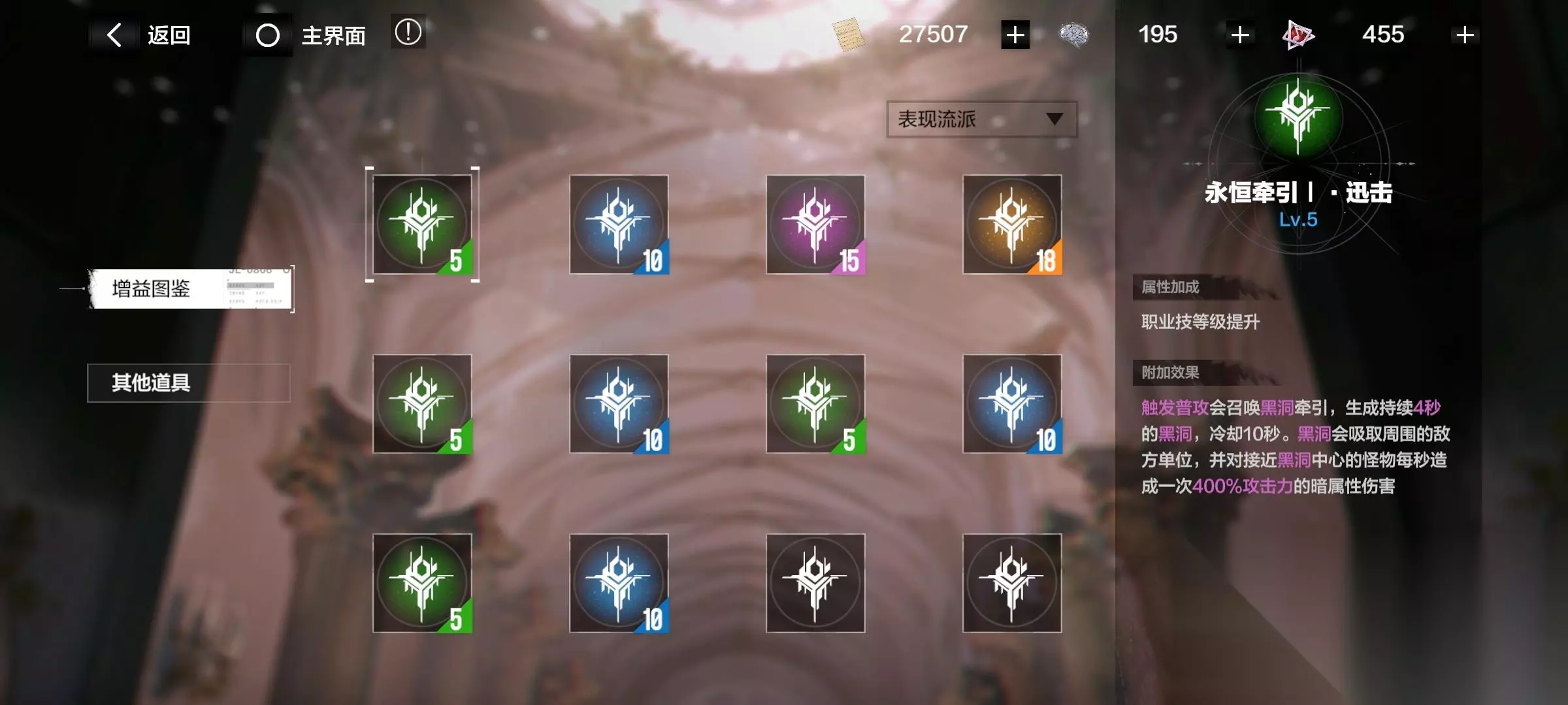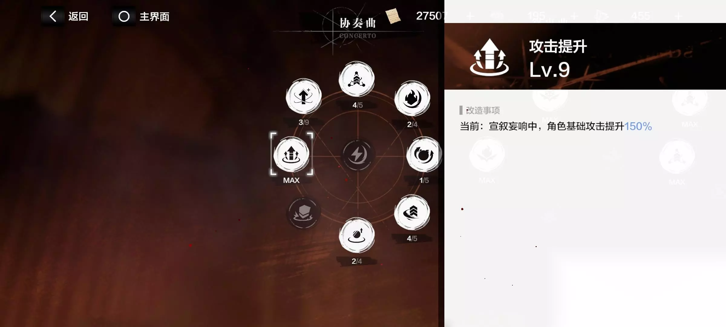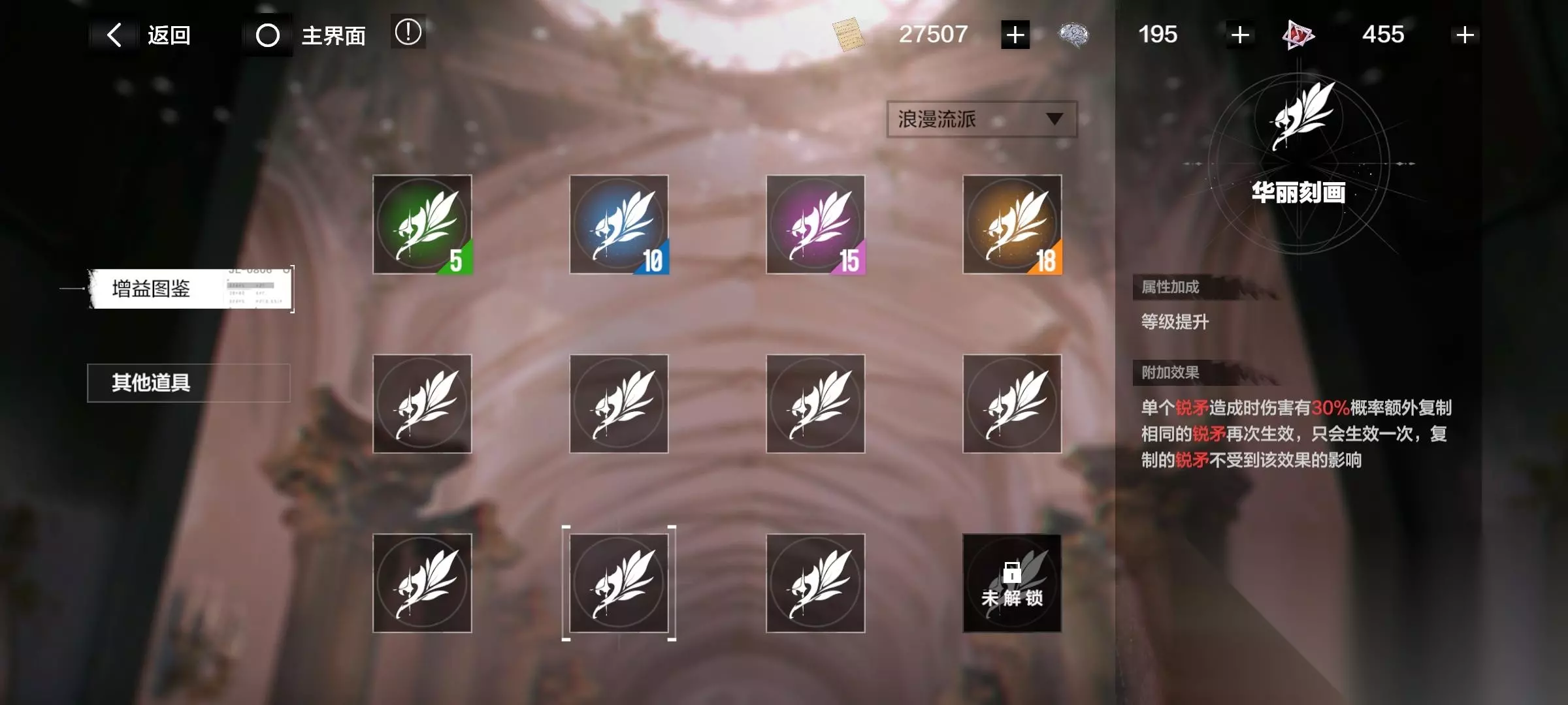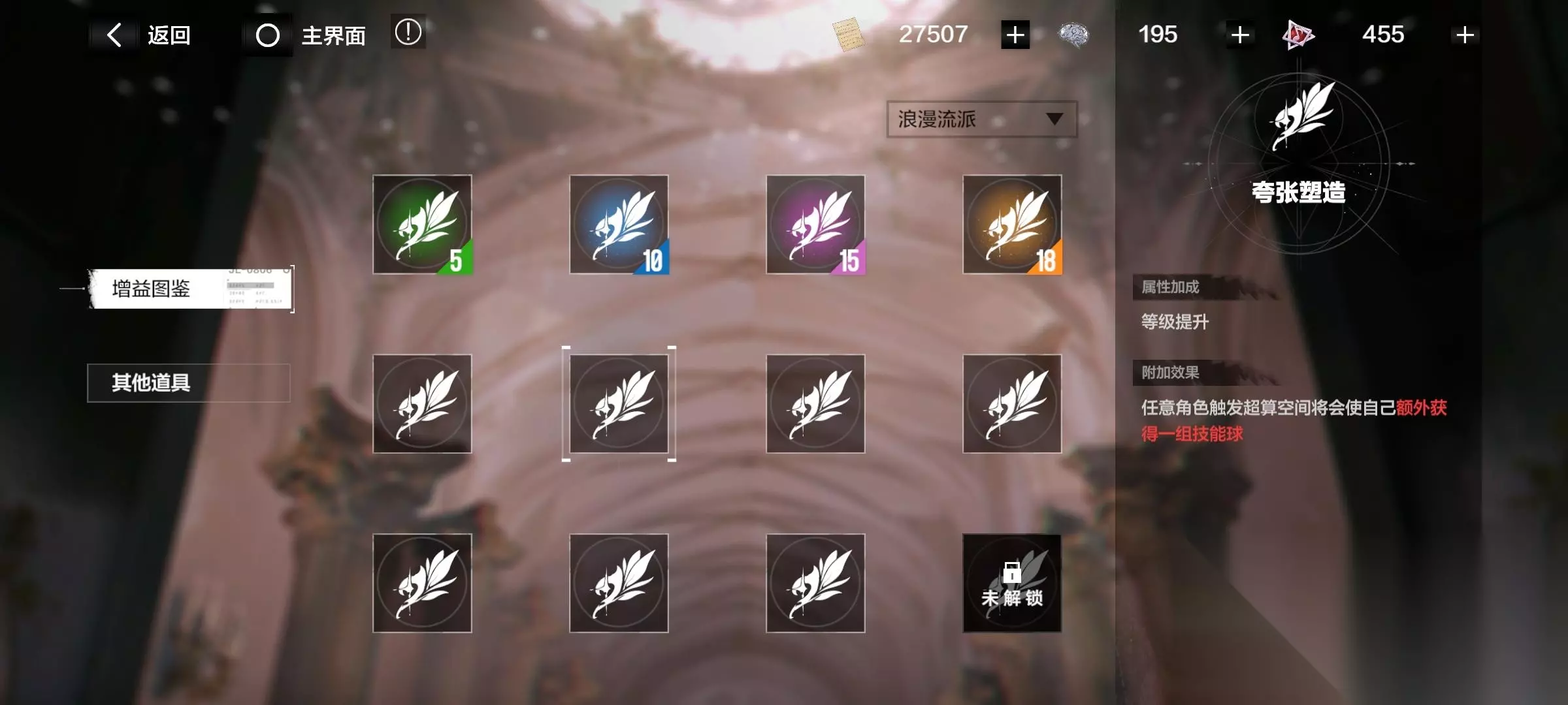 注意了!有些增益要升级流派后才开启! 消耗材料“华彩段”,提升各个流派。