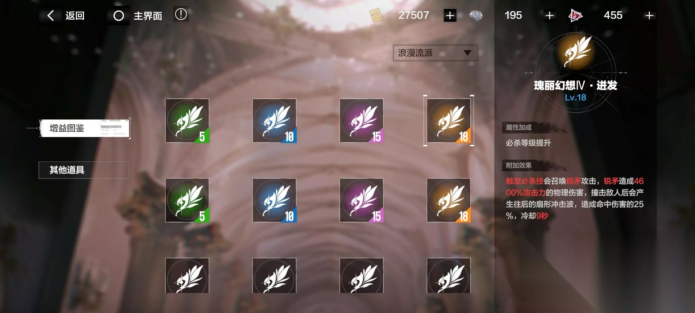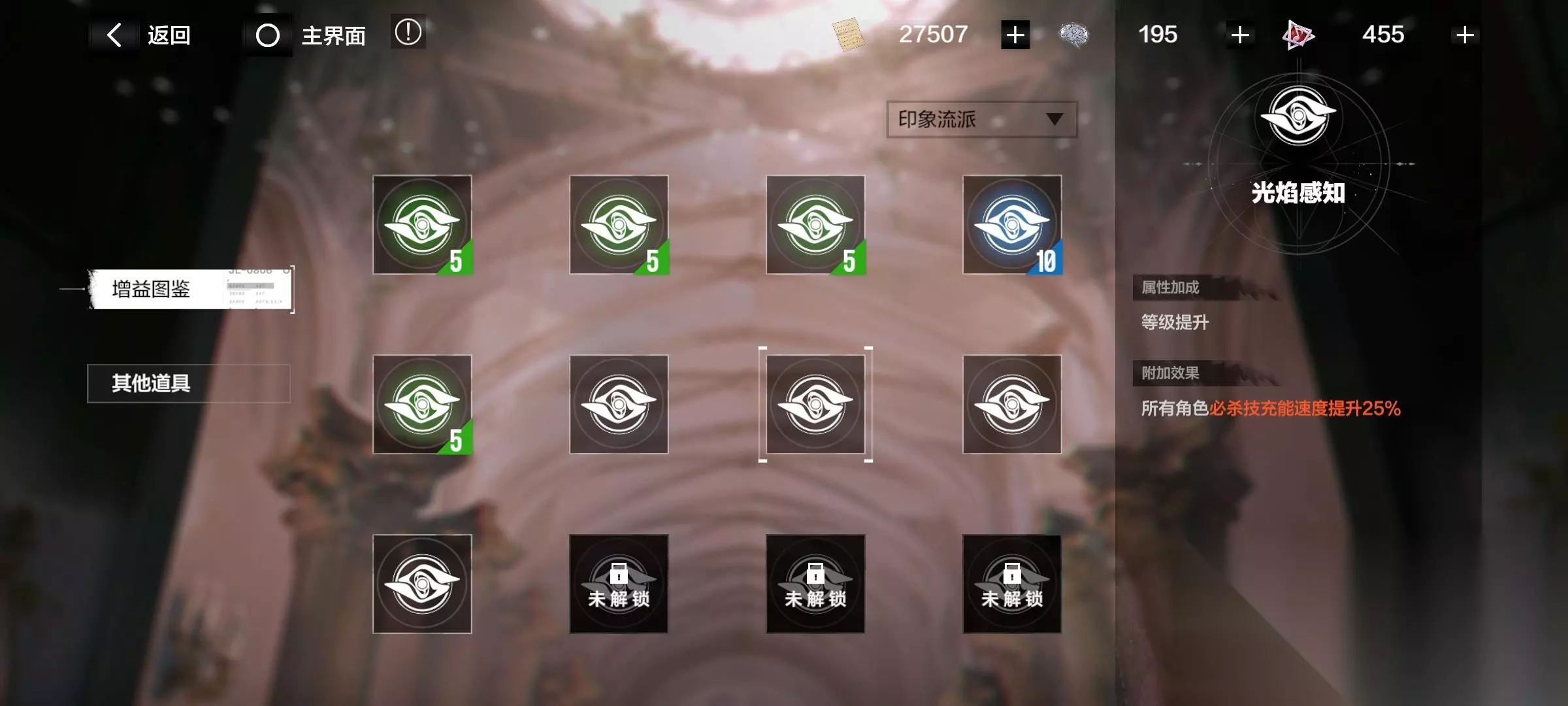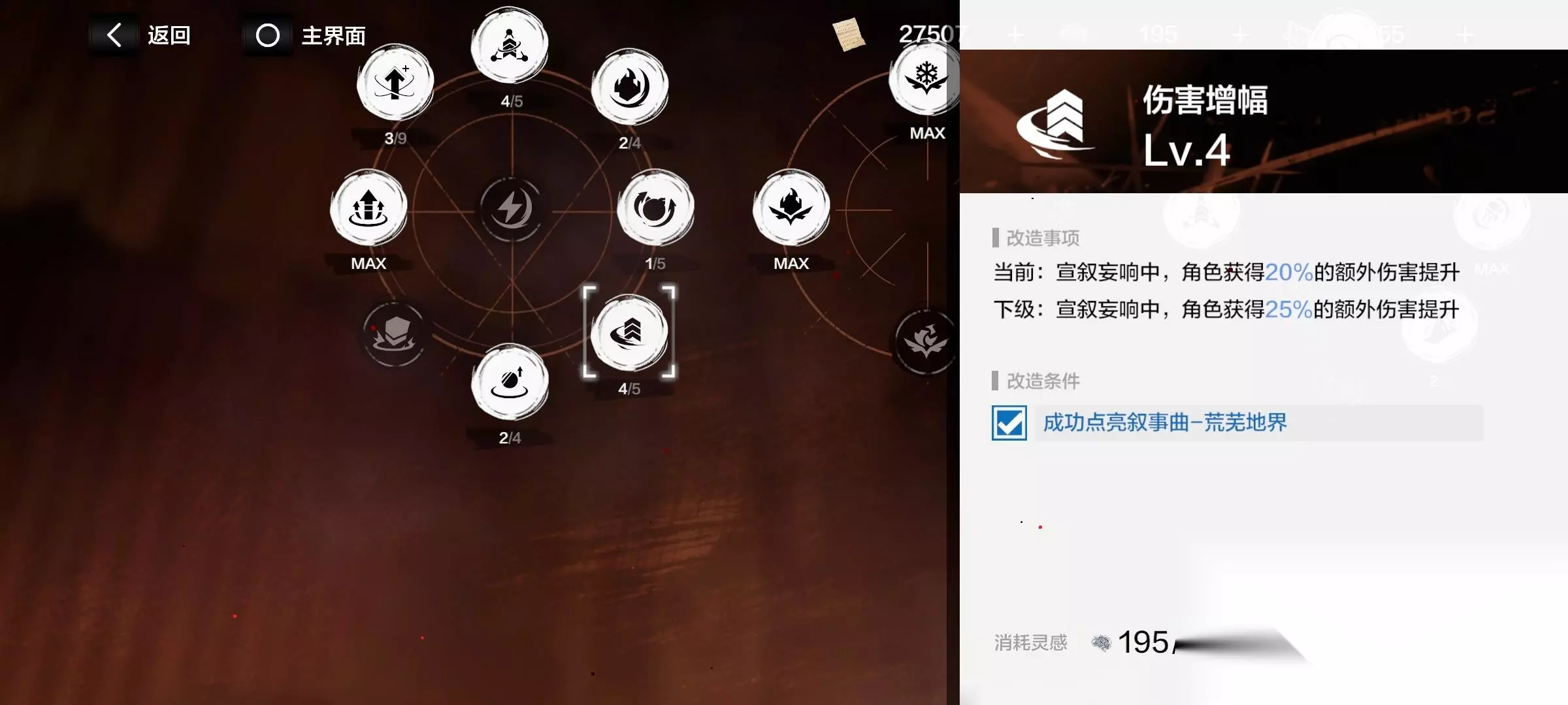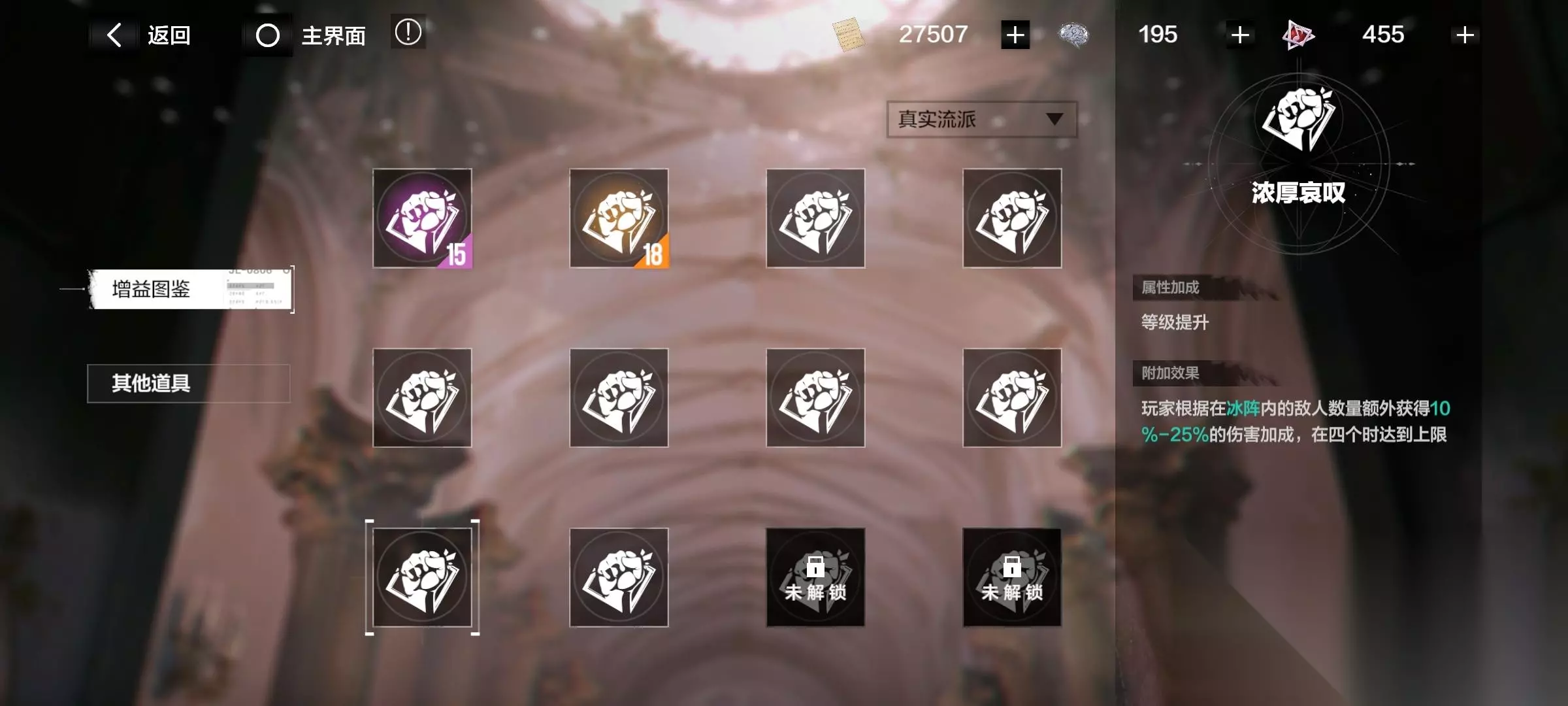 注意了!有些增益要升级流派后才开启! 消耗材料“华彩段”,提升各个流派。
