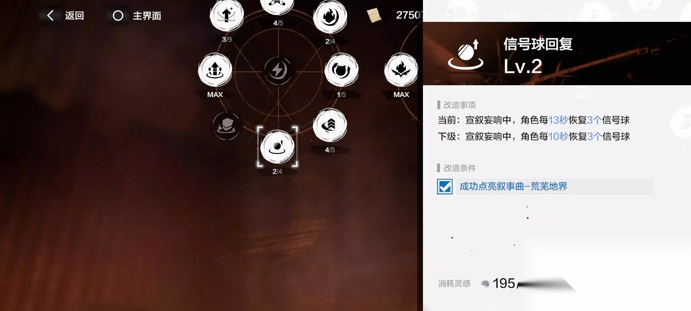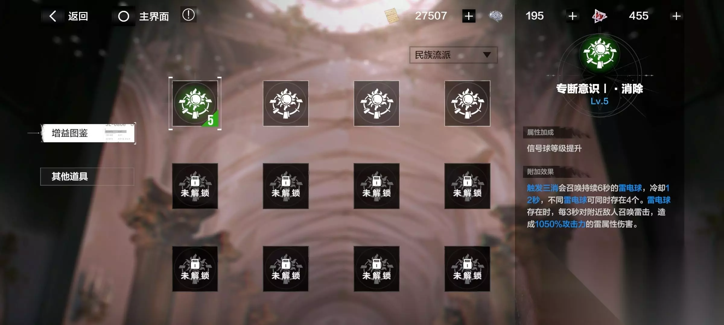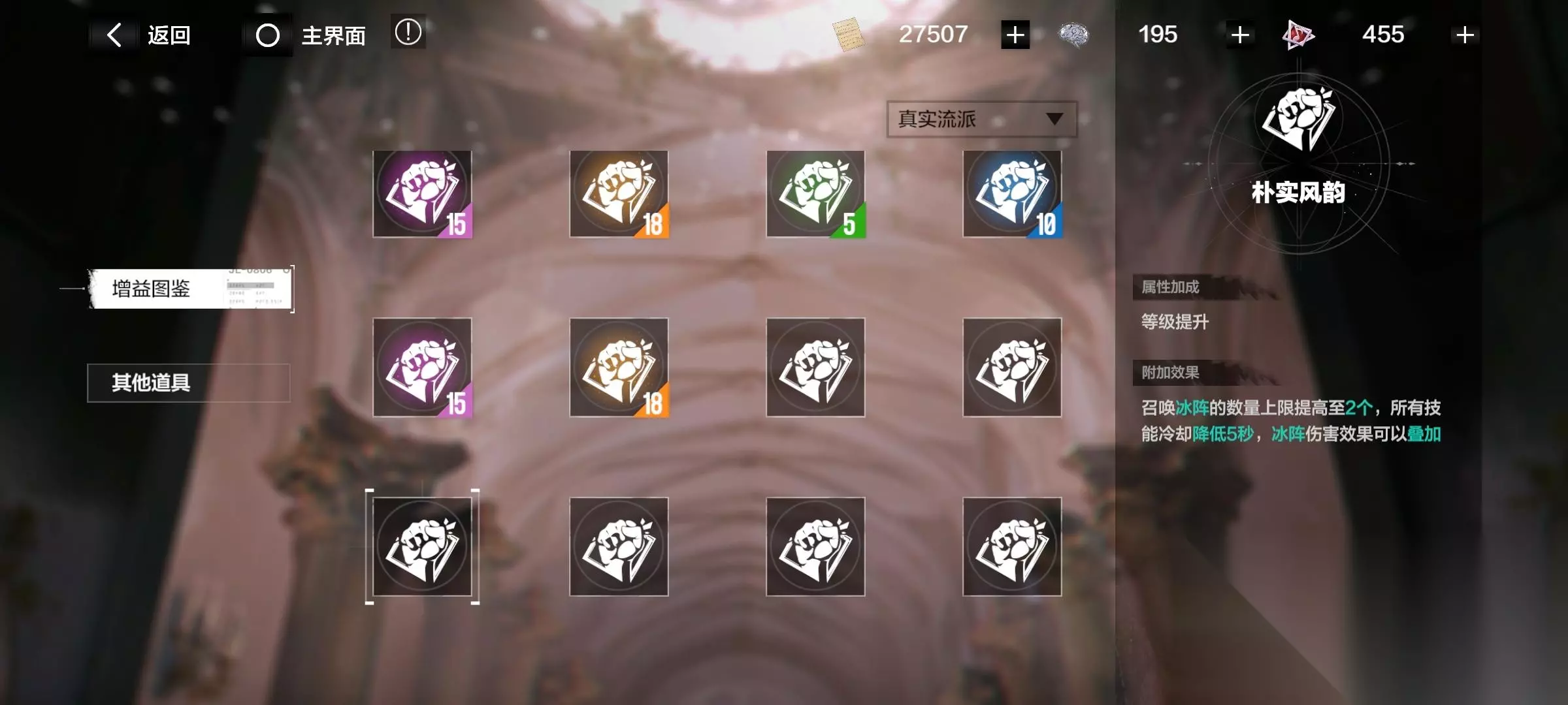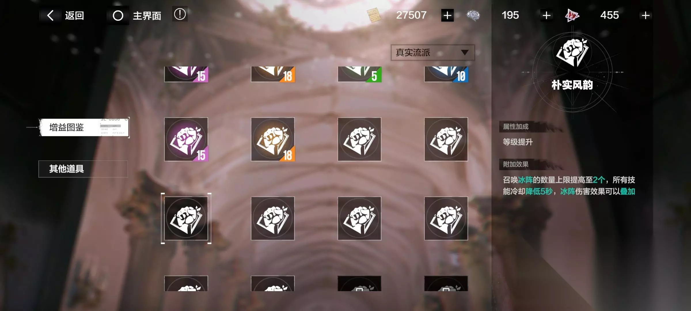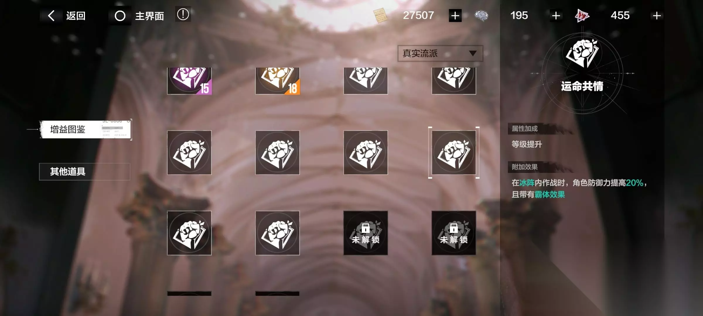 注意了!有些增益要升级流派后才开启! 消耗材料“华彩段”,提升各个流派。
