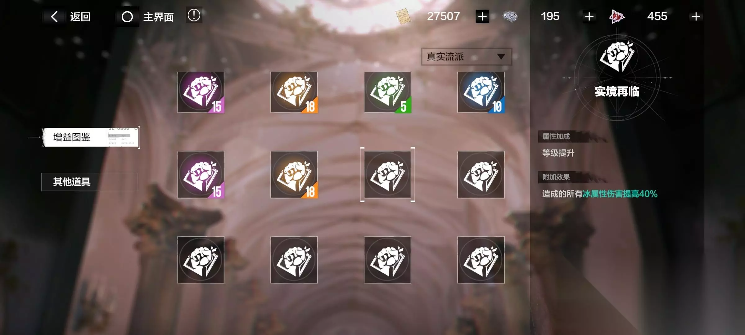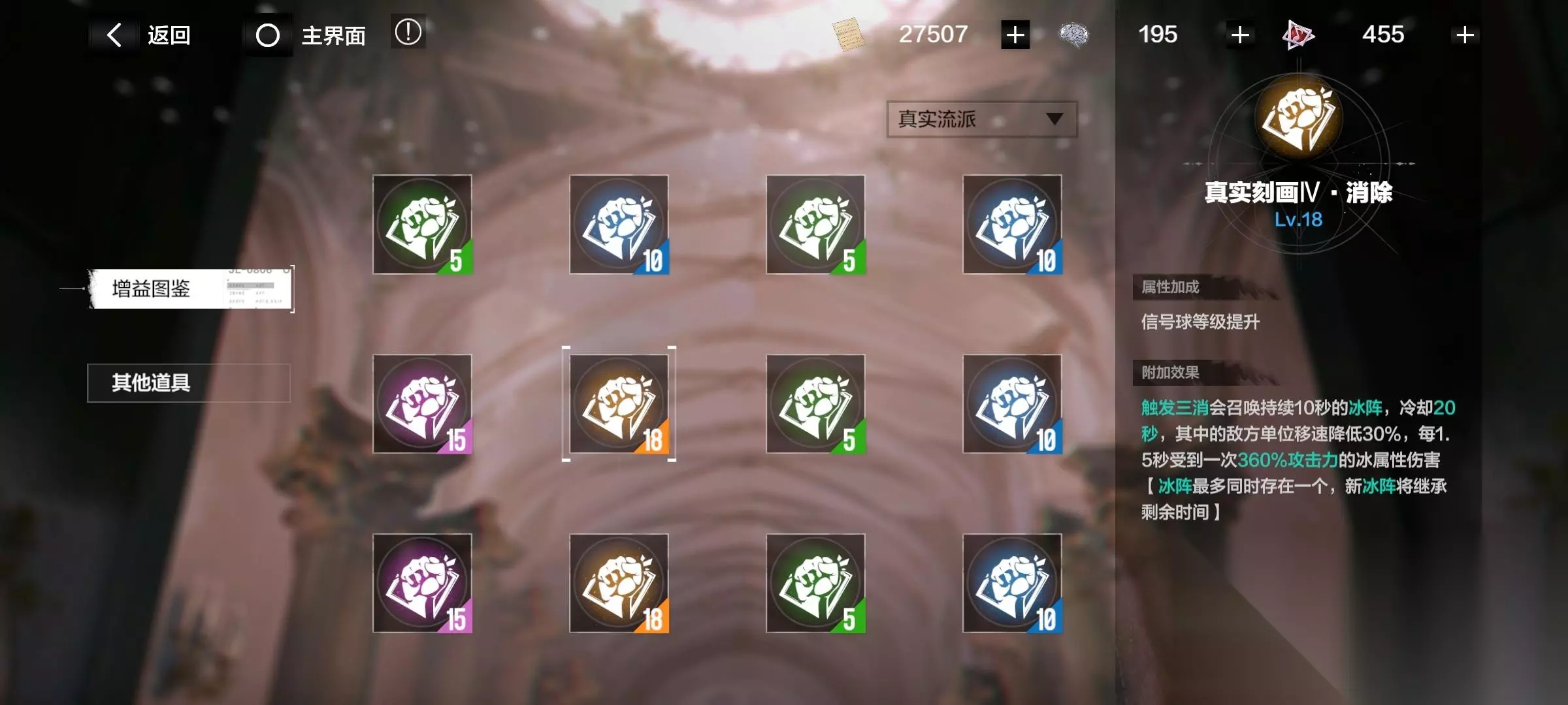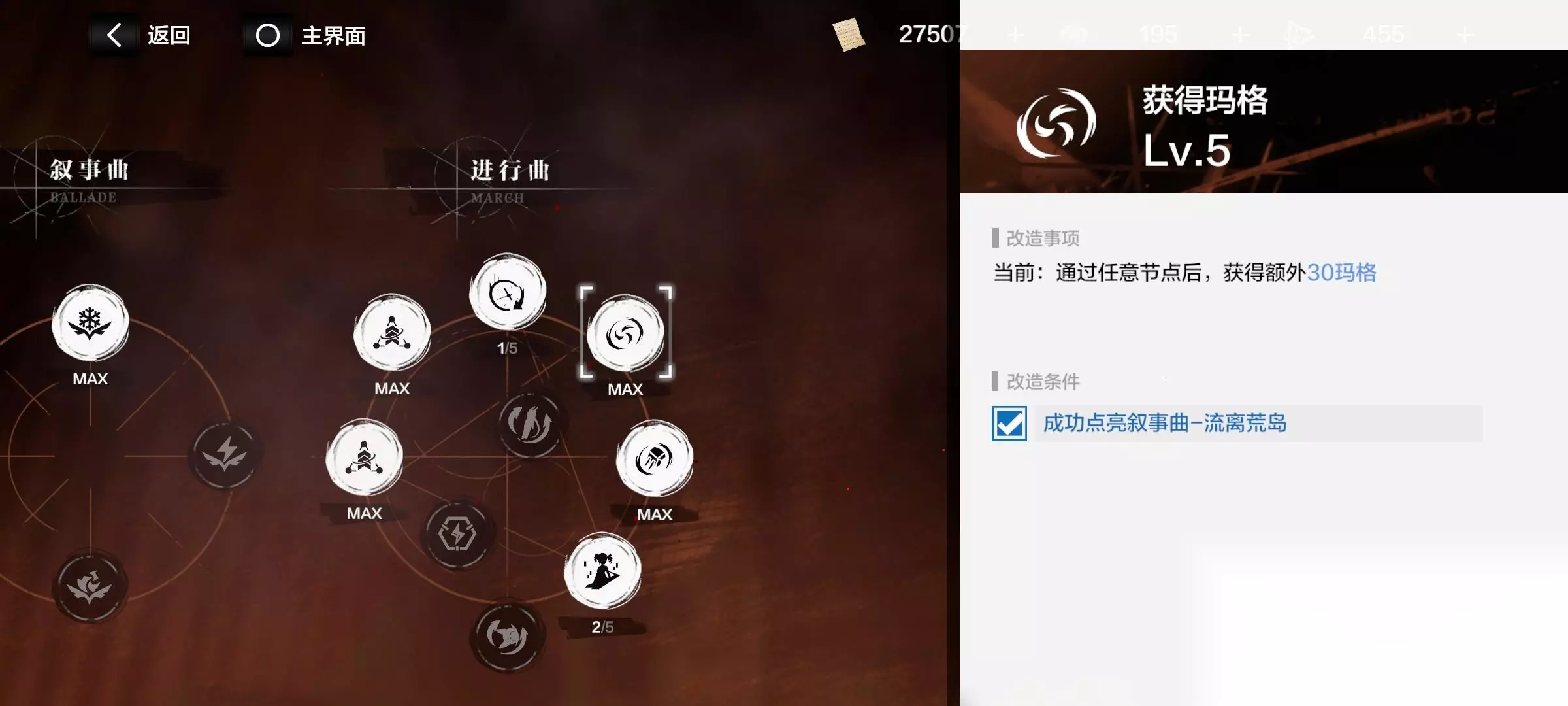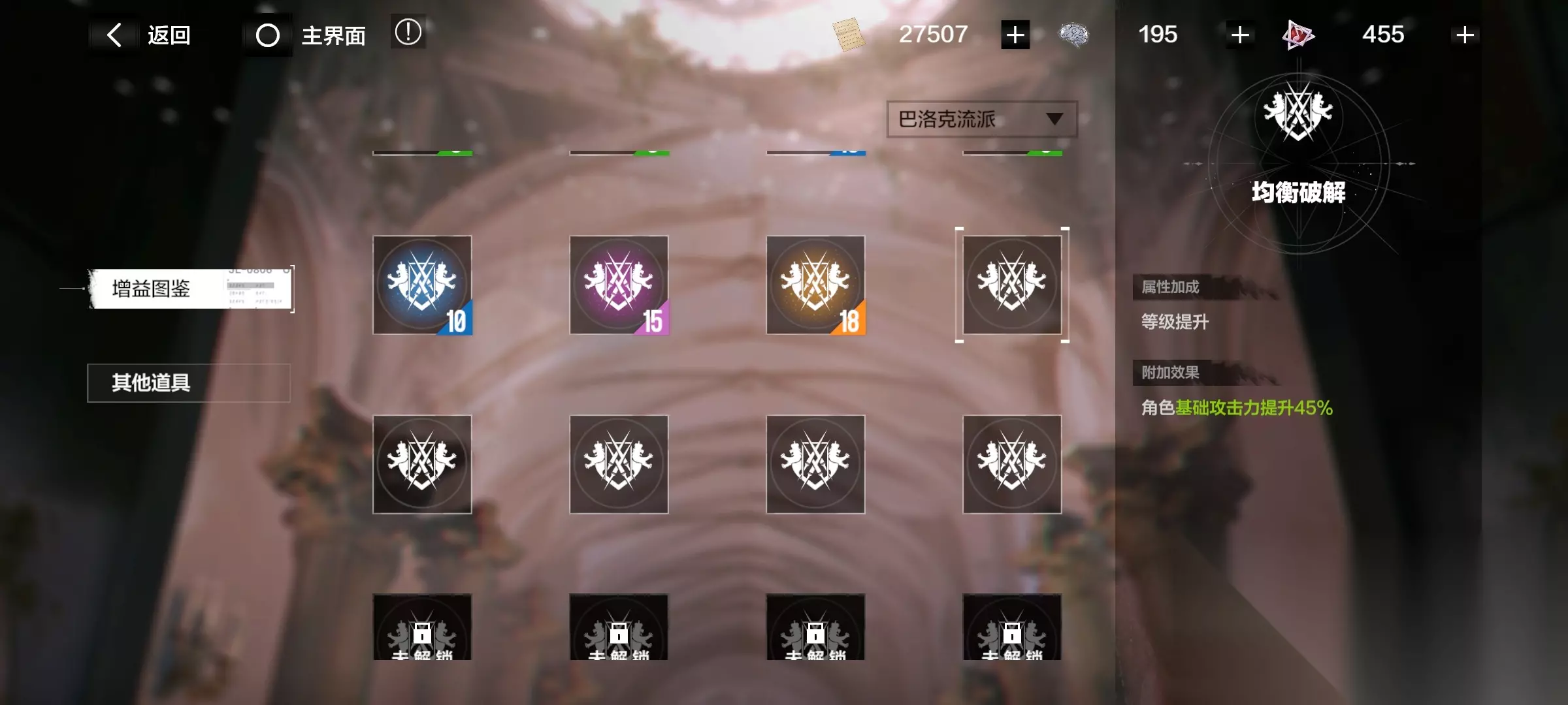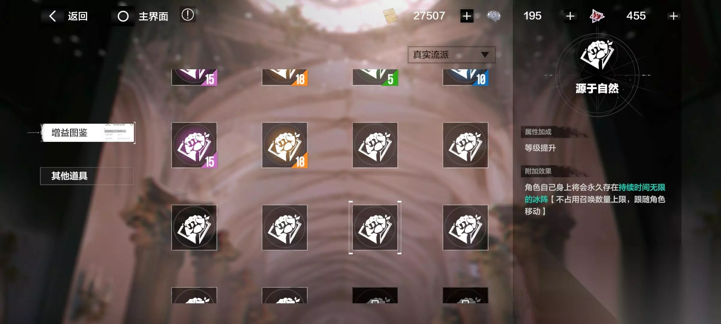 注意了!有些增益要升级流派后才开启! 消耗材料“华彩段”,提升各个流派。