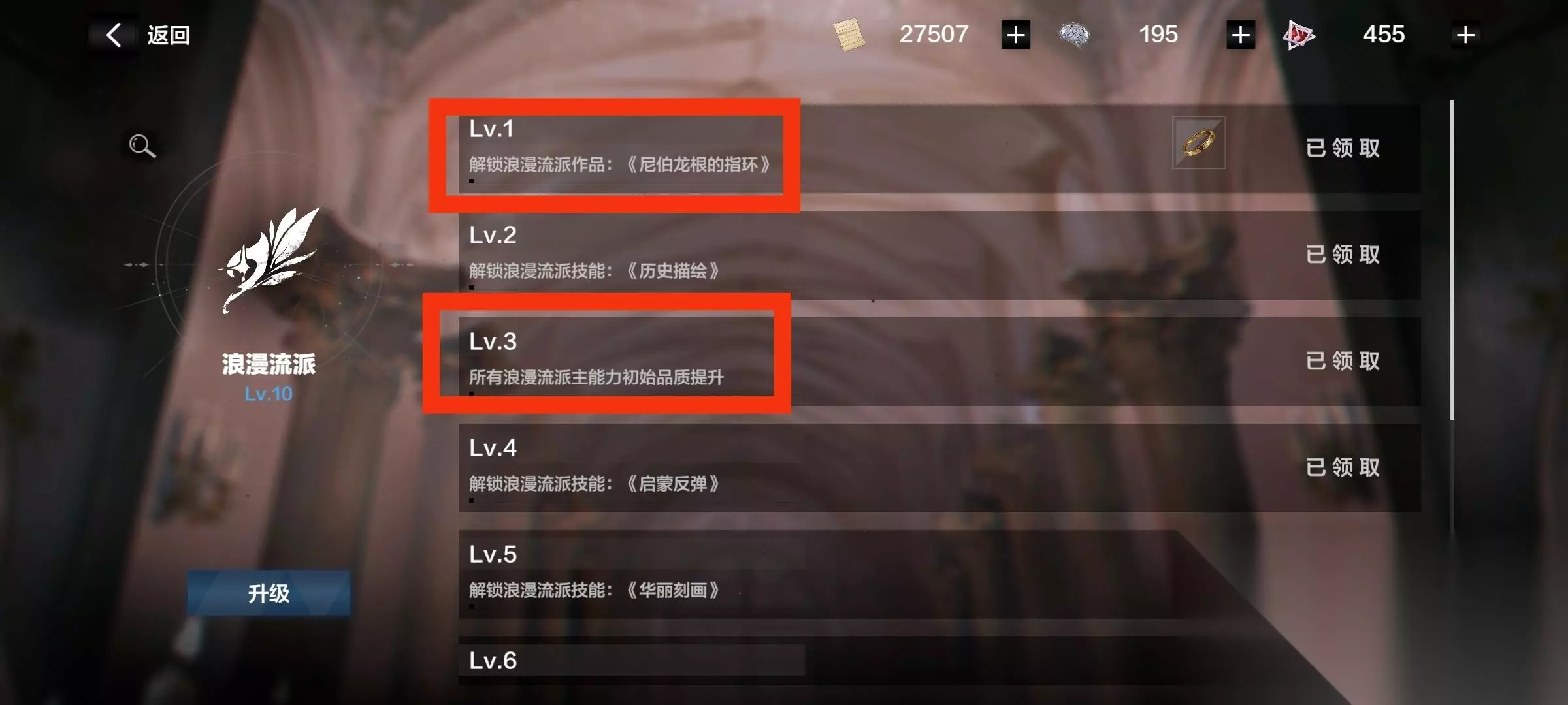 举个例子:(红框为重点,升级一次得该流派作品,推荐各流派升到3级,主玩流派升到6级就够用)