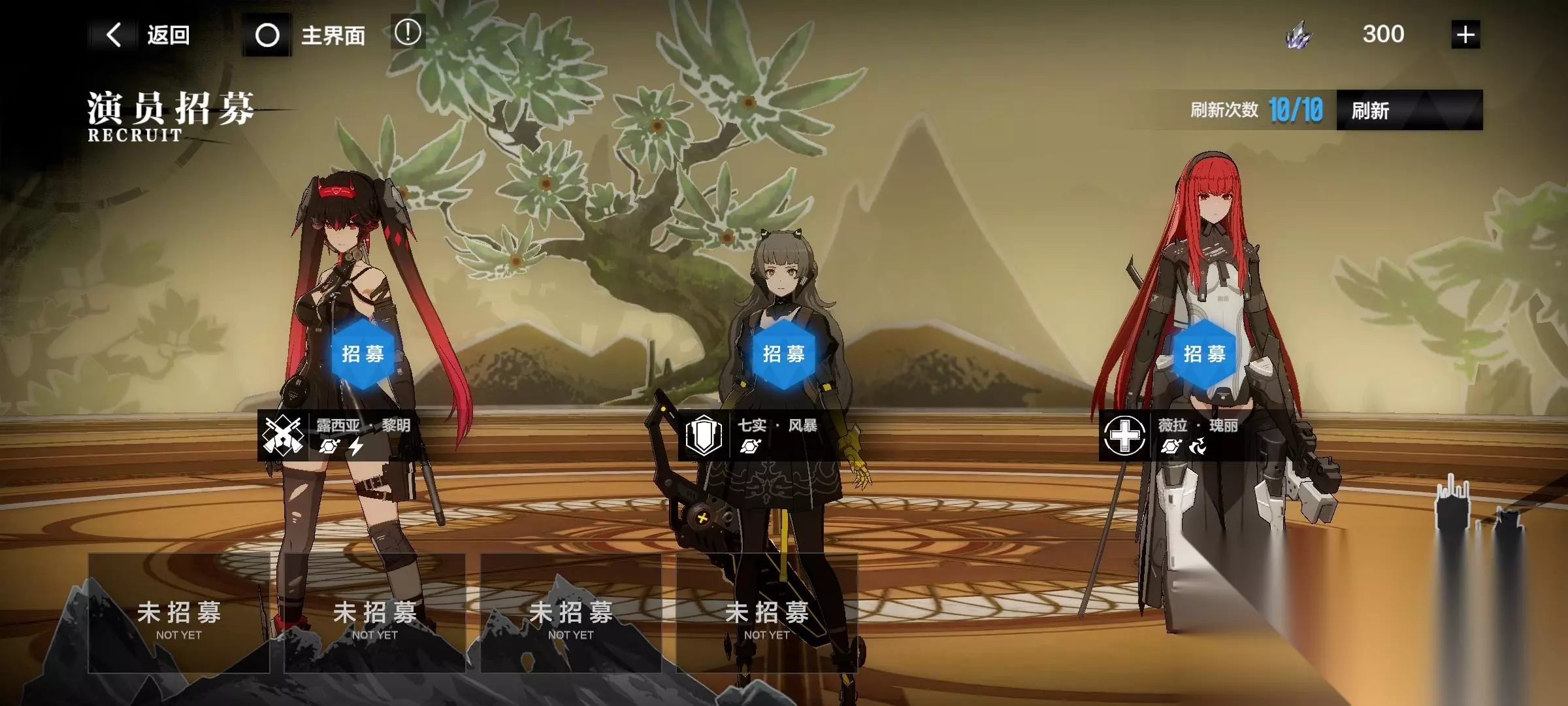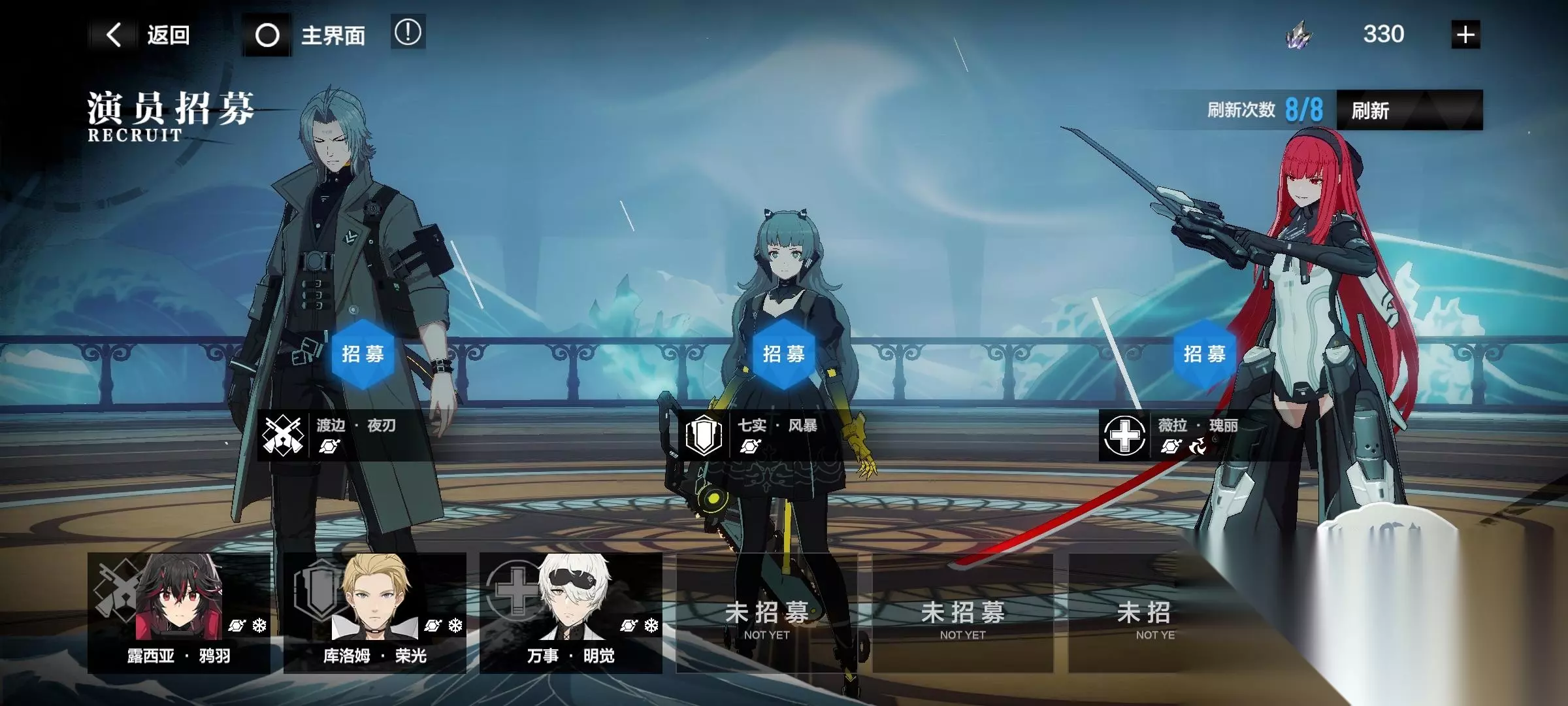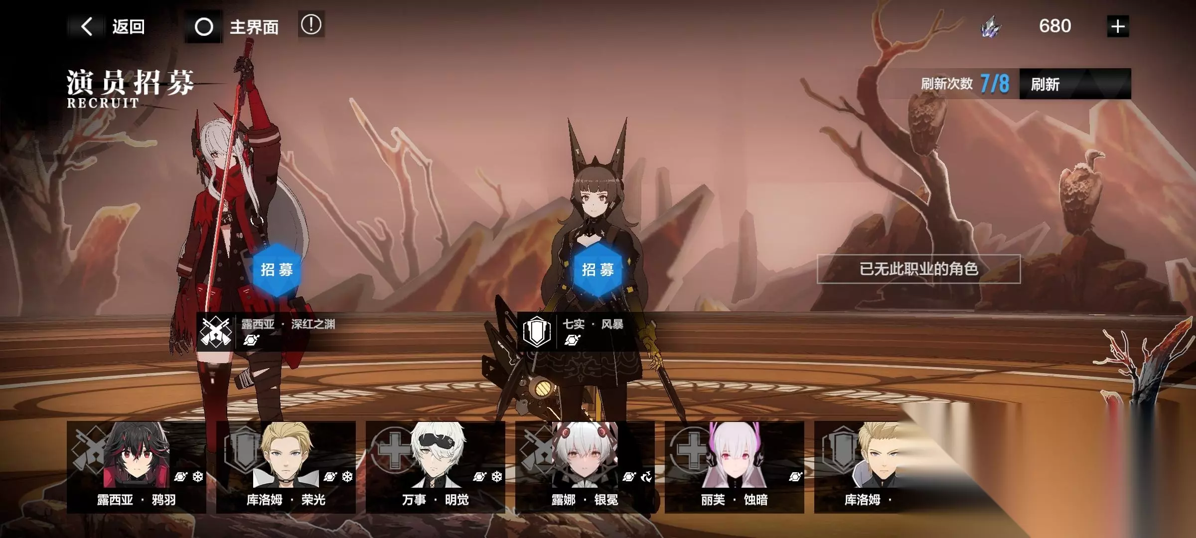 ――――――――分割线―――――――― 六、游戏流程(玩过的都懂,全是废话) 1、演员招募 说明:第一位置是进攻型,第二位置是装甲型,第三位置是辅助型和增幅型,全是构造体,没有授格者,当位置的职业人物全获得后,再次刷新,位置不会出现人物,如下图