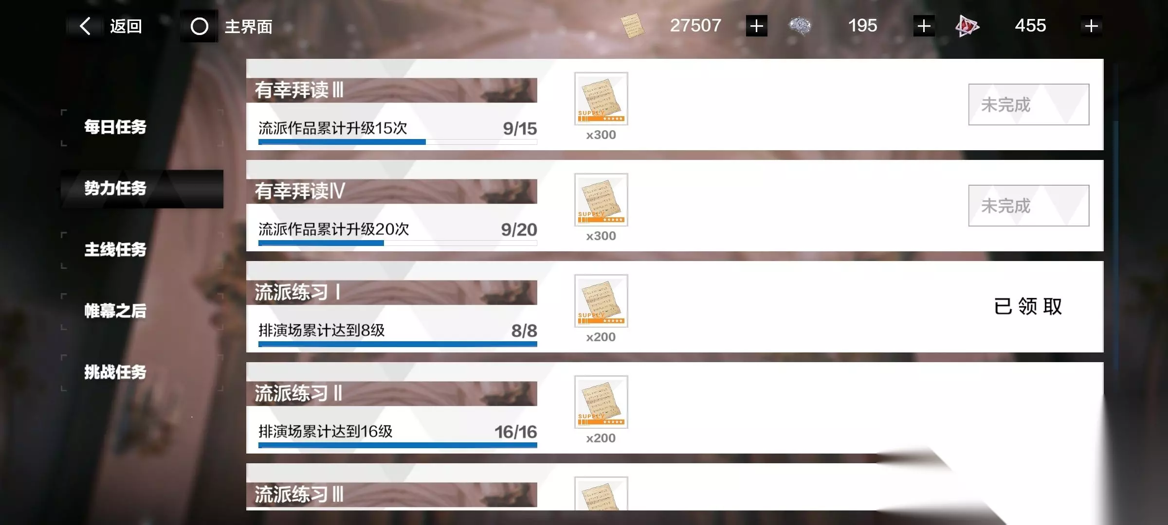 任务要求作品升级20次,五个作品升到满级就是20次升级。 升级顺序推荐(也是推荐流派):浪漫流派>真实流派>印象流派>巴洛克流派>古典流派