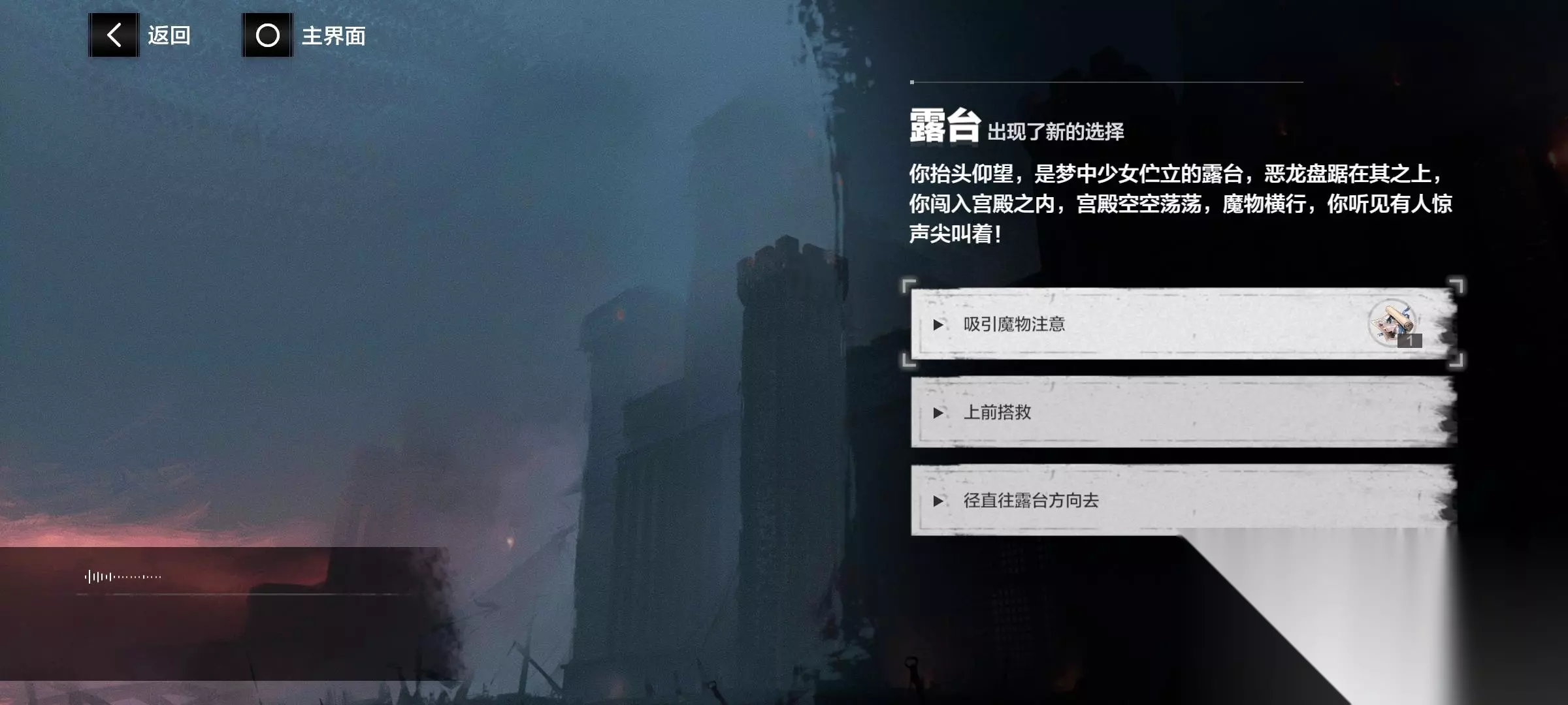 ――――――――分割线―――――――― 七、剧情方面 我不是剧情党,懂得不多。但有一说一,剧情插画特别精美。 选项的结果有:剧情、战斗、获得道具、无事发生(字面意思doge) 现在有3个周目,每通关一个周目,可以去“帷幕之后”开启下一个周目。 注意:选项和道具有无,不影响结局。分支结局也是如此(前提是要解锁)