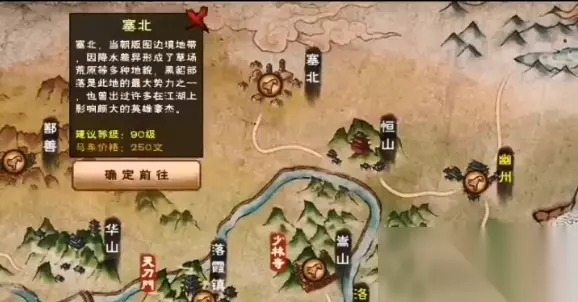 塞北地图进入方法 这张新地图并不是从幽州进去的而是从恒山进去的。 具体的坐标在恒山的(0.21)处,偏西边,具体位置看下图。在靠近边缘的位置,进去就是塞北了。 地图特色: 塞北的绣庄可以购买以及缝纫90级和90级的装备。 资源: 宝箱 (12.24)处震碎巨石获得 资源点 (9,21)乌缕,守点怪85级 树桩 (7,28) (24,27) (22,16) (12,21) 商店: 塞北缝纫 【90级装备及图纸】:吉达护腰*5、乌斯护腕*5、呼如木甲*5、苏布宝戒*5、其木格坠*5; 【饰品】:虎溪冠*1 【材料】:乌缕*5
