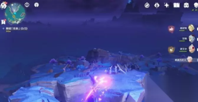 2.进入传送门会自动送到任务触发地,图中角色所在的位置就是终点,触发三个旗帜的位置(感叹号标记的地点)通过旁边的雷极可以到三个旗帜的位置。