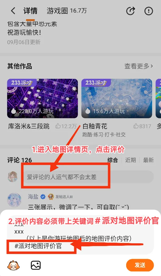 评价内容必须带上关键词 #派对地图评价官(否则统计不到评价内容哦~)