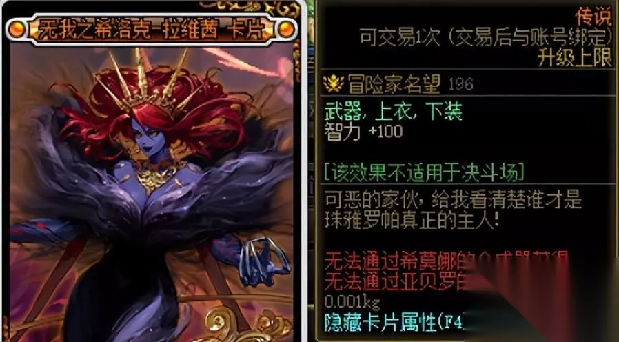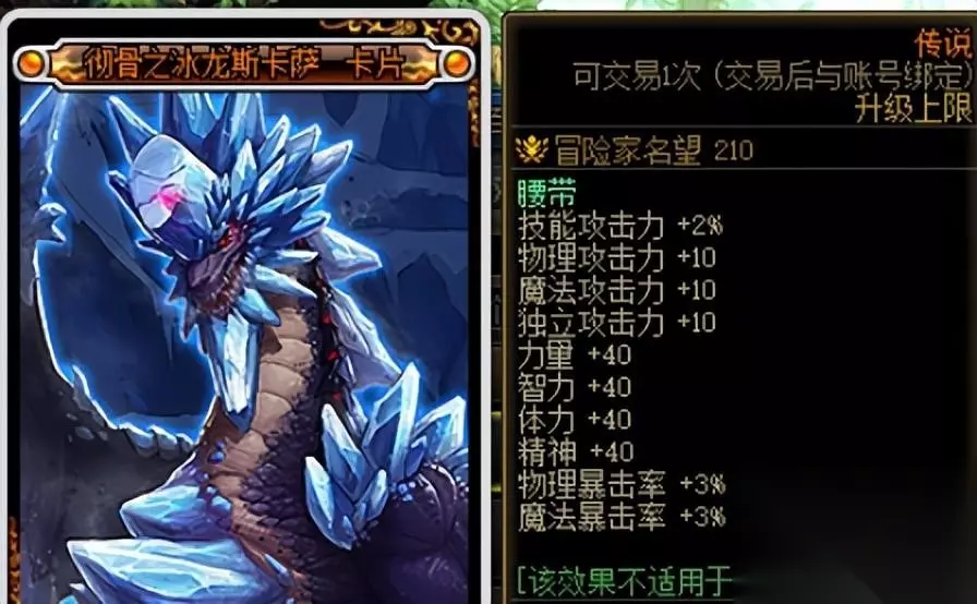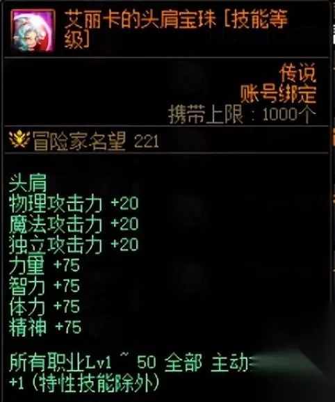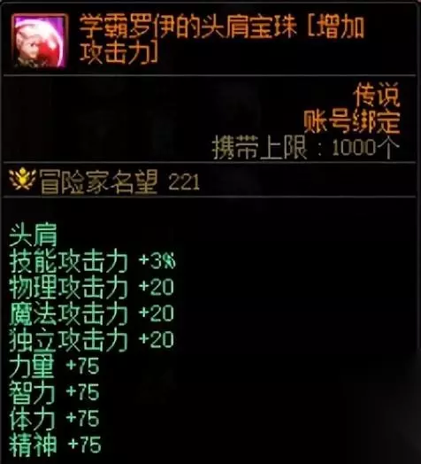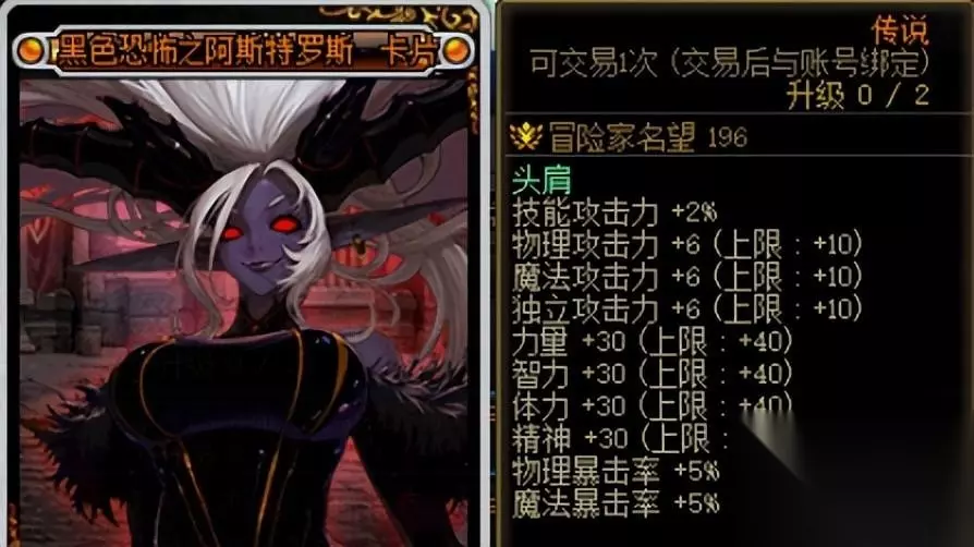 上述卡片的满级售价大约为1700W,坯子价格大约在270W金币左右。 扣除手续费,平均每张卡可赚200W金币左右。 加上这些卡片非常容易获得(每周开卡片册+军团地下城材料兑换),所以非常推荐用这些卡片。 二、自用提升附魔道具 获得的5张传说卡片也可以升级买来的未升级附魔卡片,给自己的角色使用。 下面将附魔部位进行分析。 肩膀部位在游戏内可获得最好的道具是【黑色恐怖之阿斯特罗斯】。 在未升级的时候就已经提供了最主要的2%技攻加成,升级只提供少量三攻四维,另外肩膀部位还有更好的节日礼包宝珠,所以升级优先度较低。