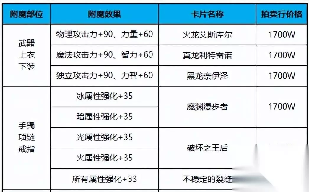 一、顶级附魔,但价格并不高的可交易卡片 若想快速将卡片换成金币,需要优先考虑毕业级别的附魔卡。 故可以优先考虑 1、0升级情况下价格为坯子价 2、升级后为毕业附魔 满足以上两点的附魔卡片 理清思路后,推荐卡片如下: