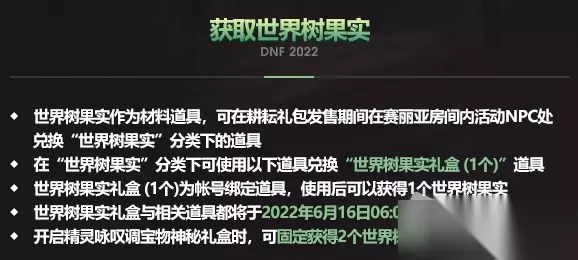 dnf世界树果实获得方法 获取攻略: 1、世界树果实需要开启精灵咏叹宝物神秘礼盒必定可以获得2个世界树果实。