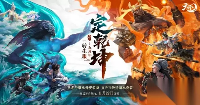 新服【定乾坤】上线在即,现已开放预约,11与22日,一起登录游戏探索全新对战玩法! 该项目也被称为“老号转生”计划,旨在唤醒少侠们尘封已久的老账号,让他们的角色以全新的面貌重生。 而这项备受瞩目的“斗转星移”计划,第一期将于11月22日正式开启,其首个落地对象、天下历史上首个转生服——全新服务器【定乾坤】,亦将同步来袭!新服除了拥有全新的阵营PVP玩法、开服直升79级、外观数值可继承等诸多亮点外,更有海量重磅福利送给大家,敬请少侠期待!