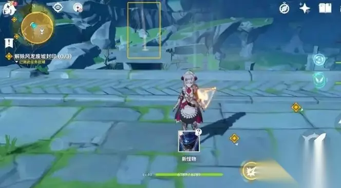 进入风龙废墟之前,需要把角色的武器都换成最低属性的,尽量带上星级较低的武器,同时把身上的圣遗物给卸掉。在地图中找到苍风高地锚点并传送过去,不用去理会在传送点附近出现的小怪以及普通宝箱,直接控制角色来到风龙废墟的入口这里。把守卫在此处的两只小怪引到前方平台上面的小洞前面,接着控制角色把怪物往小洞的下面推,然后自己也跟着往下跳。