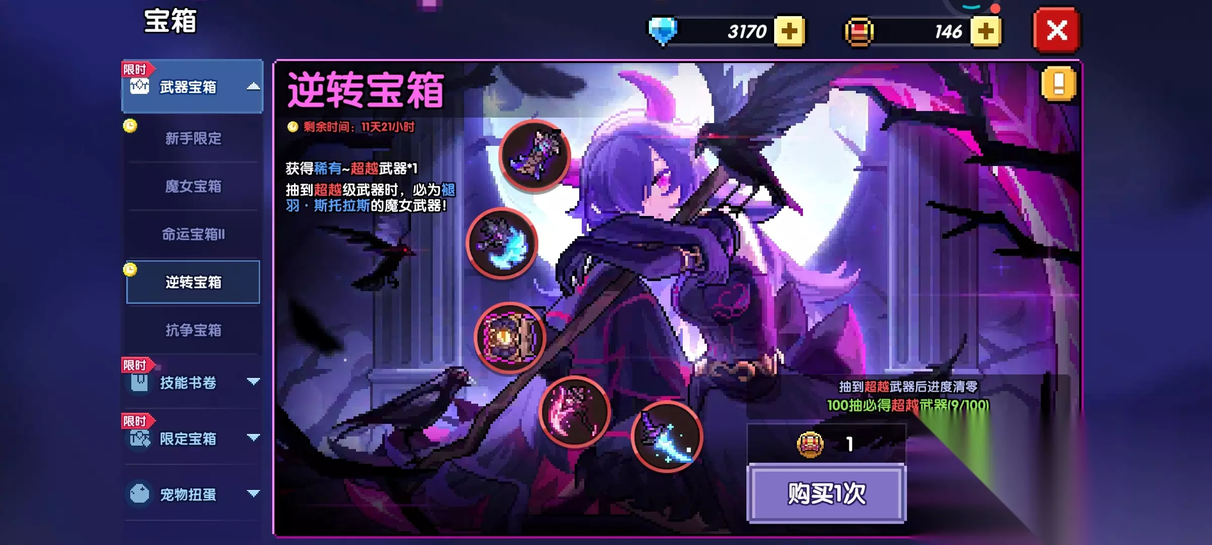 3、紫色、橙色武器只需要升到3星,最多到4星就够了,不用再升,后面留着当狗粮喂给要升5星的武器。 4、小秘境通关100层后就会解锁抗争系列BD,到时候我们再开始抽武器(图4),配合当期有70抽保底1个水系武器宝箱的活动(图5),直接保底100抽就能有2把新水魔女武器。